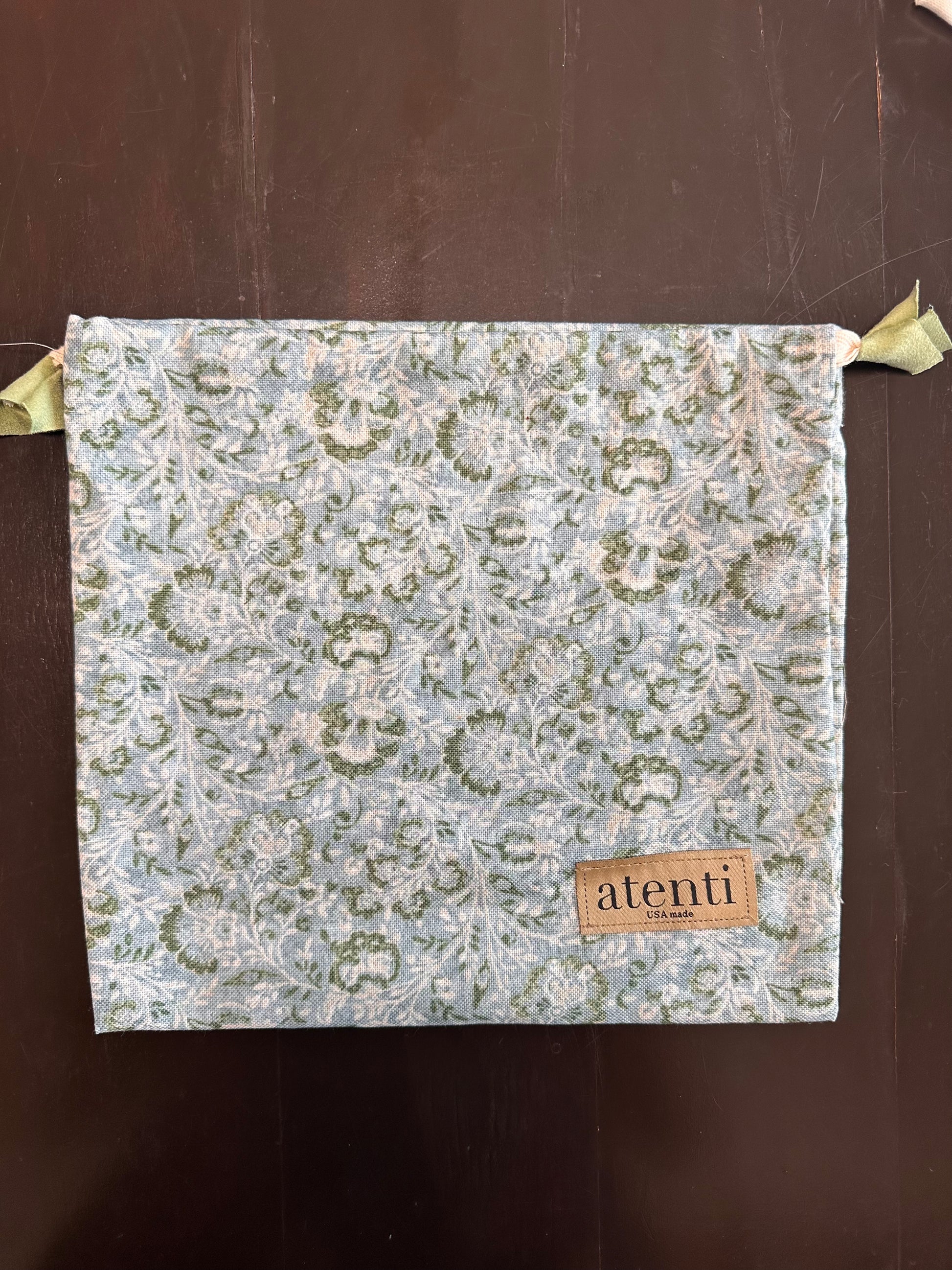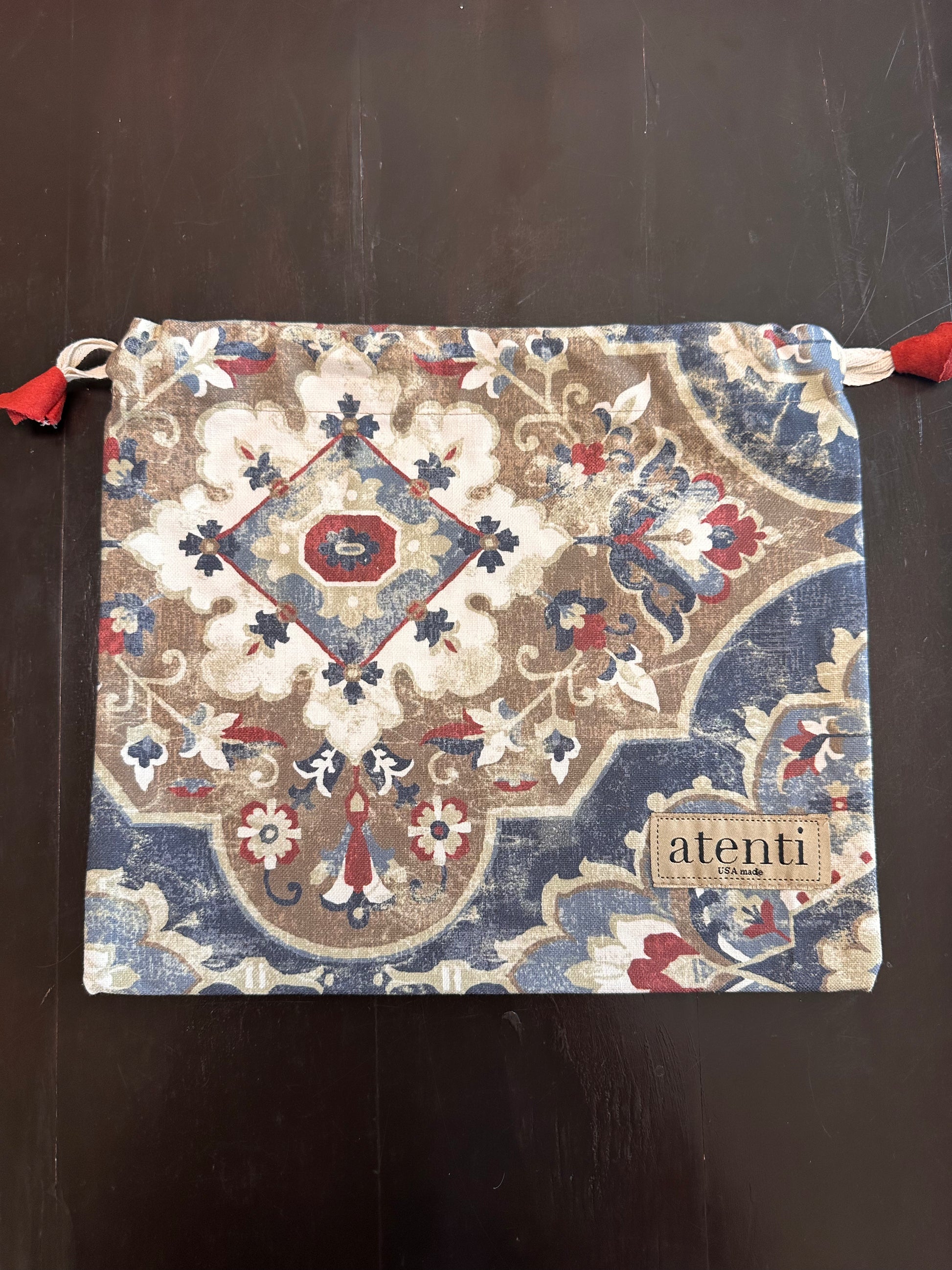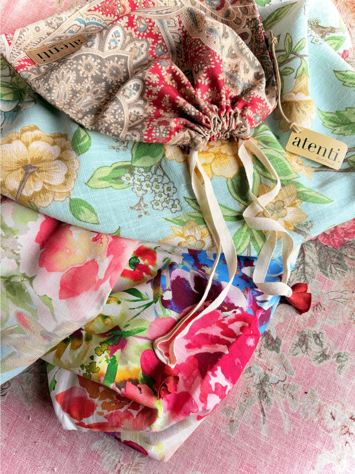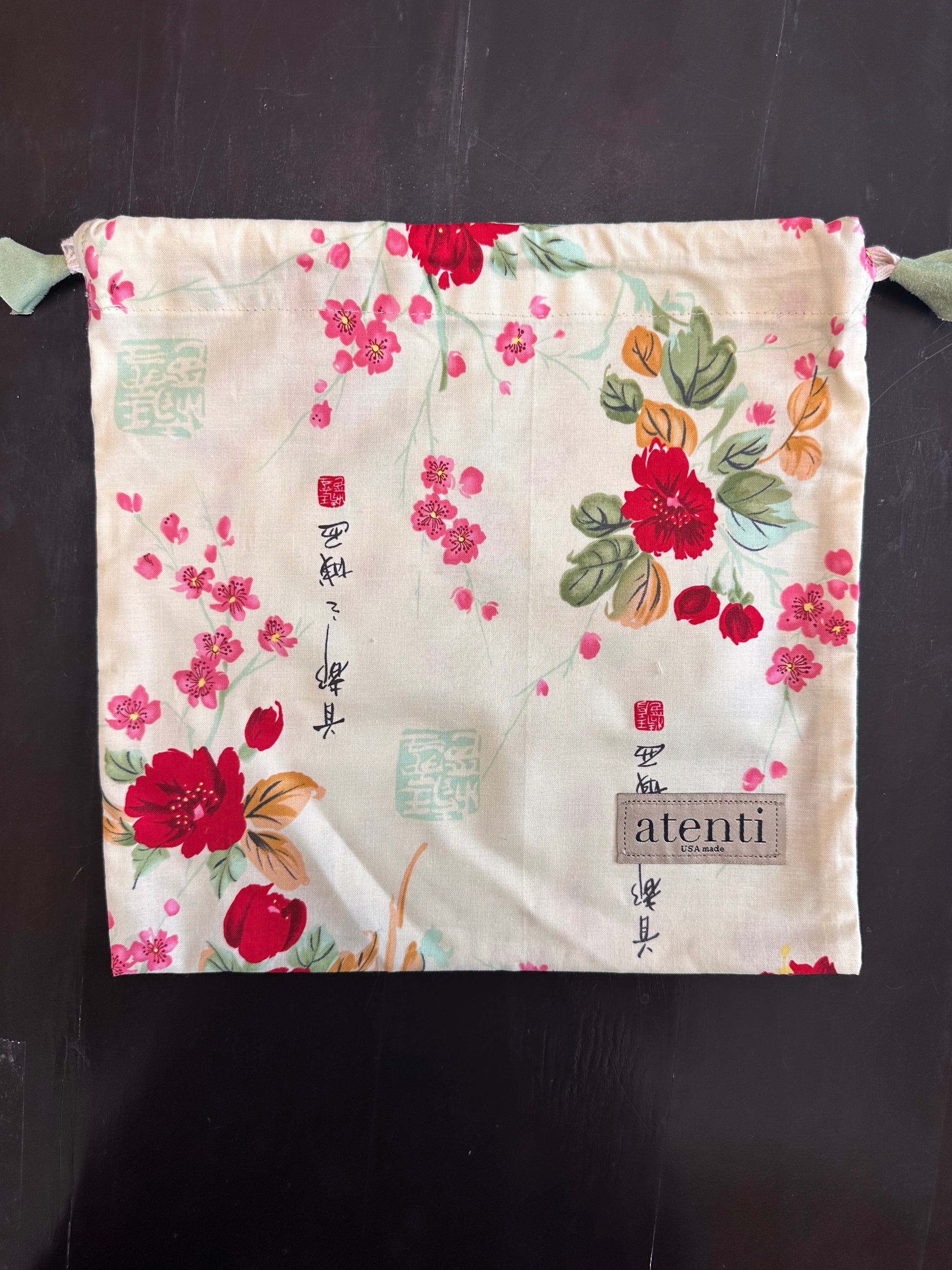 These small drawstring bags are perfect for small projects. Lightweight, with a cute touch on the drawstrings. Perfect as a little purse with wallet inside and a project, fits over your wrist quite nicely. Machine wash and lay flat to dry. I love it. You cannot have too many of these.
