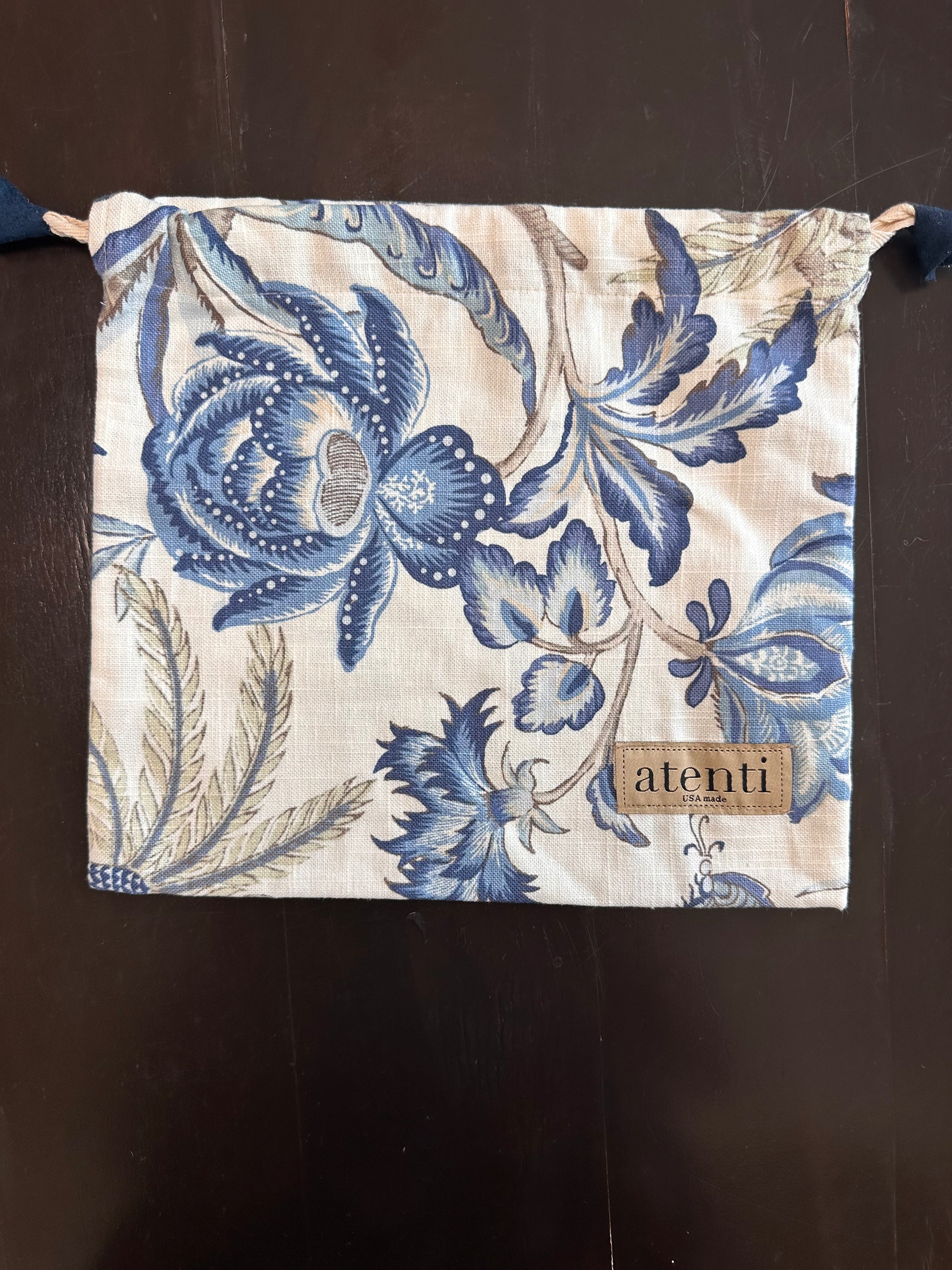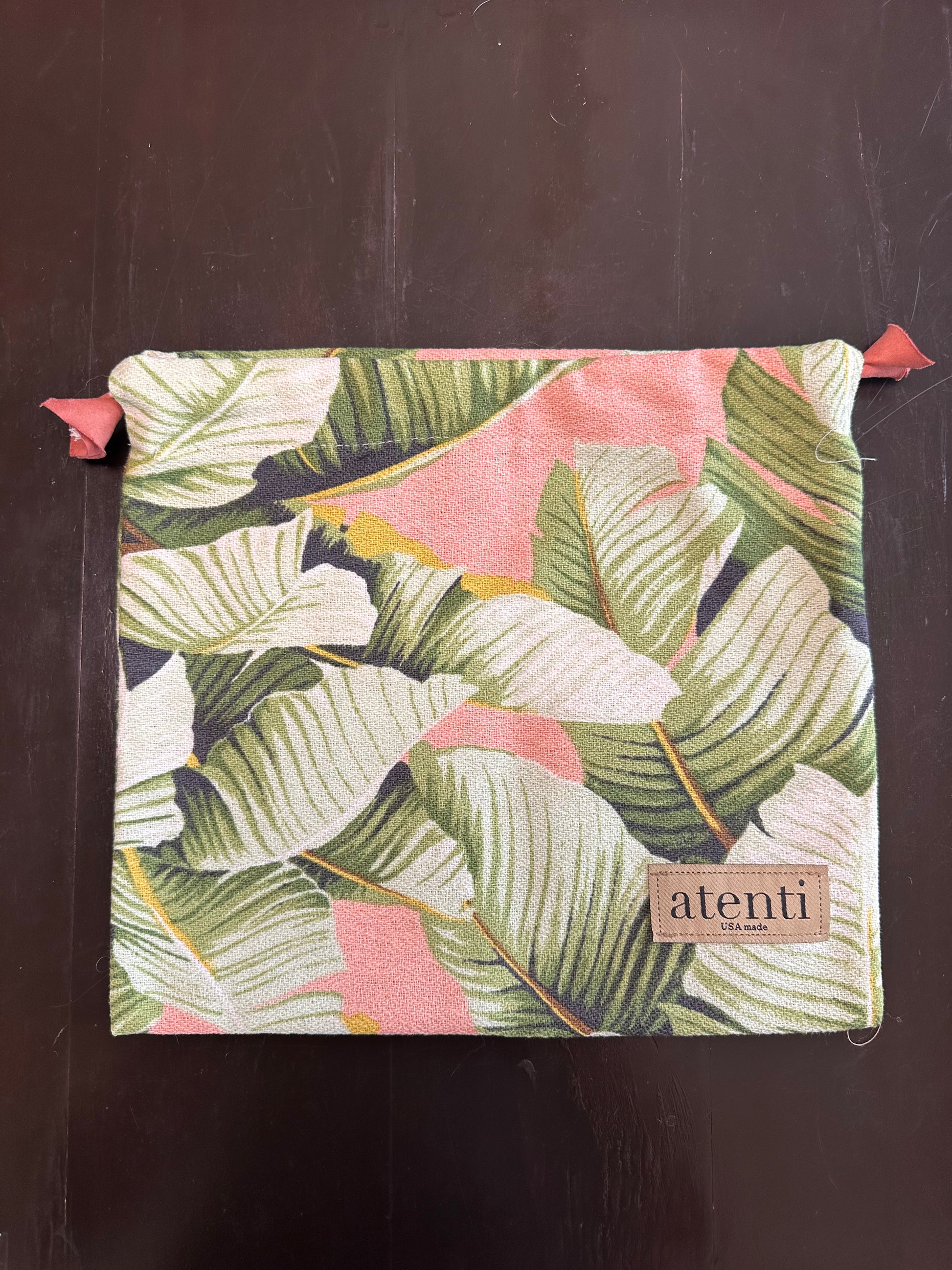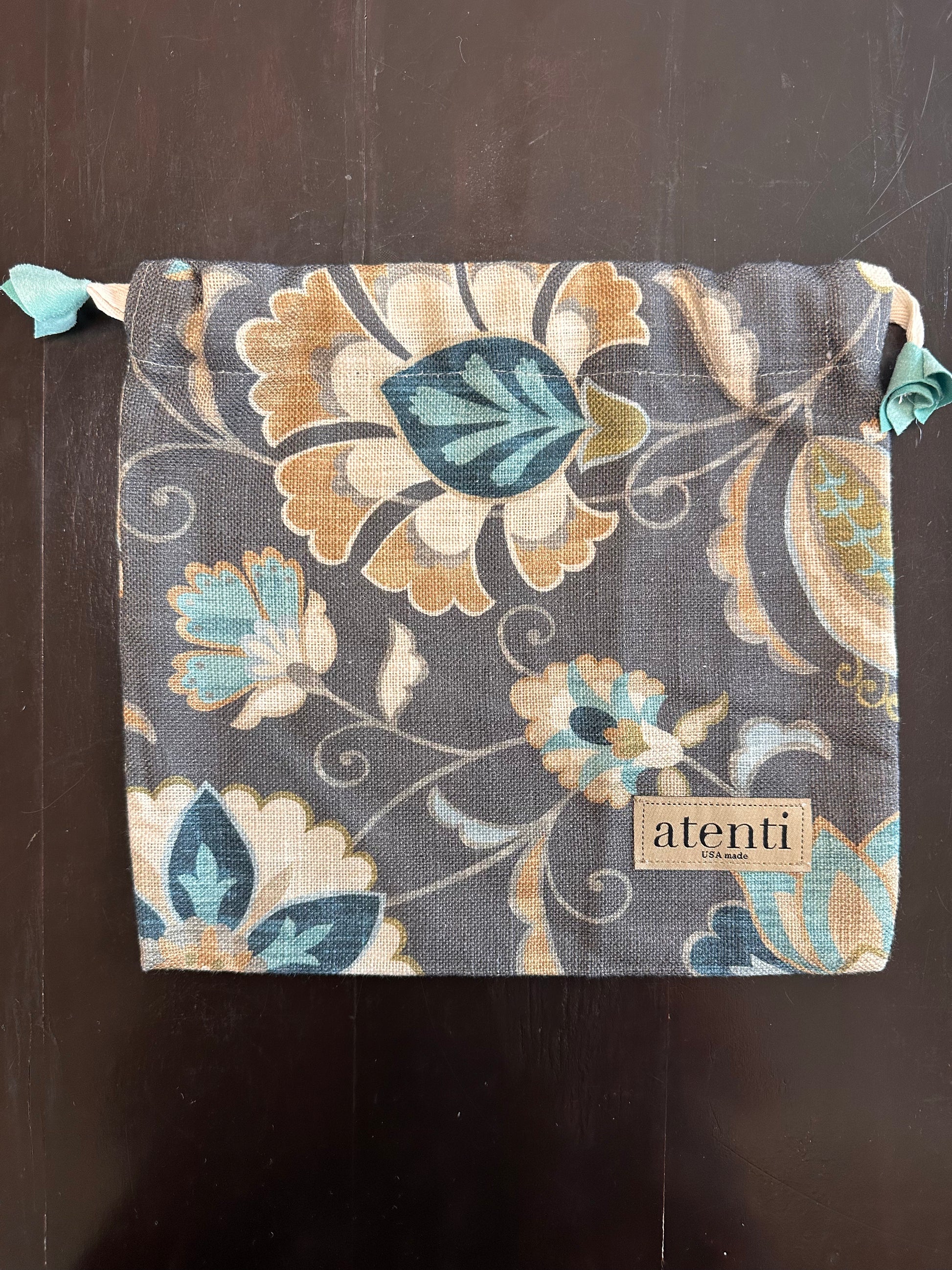 These small drawstring bags are perfect for small projects. Lightweight, with a cute touch on the drawstrings. Perfect as a little purse with wallet inside and a project, fits over your wrist quite nicely. Machine wash and lay flat to dry. I love it. You cannot have too many of these.