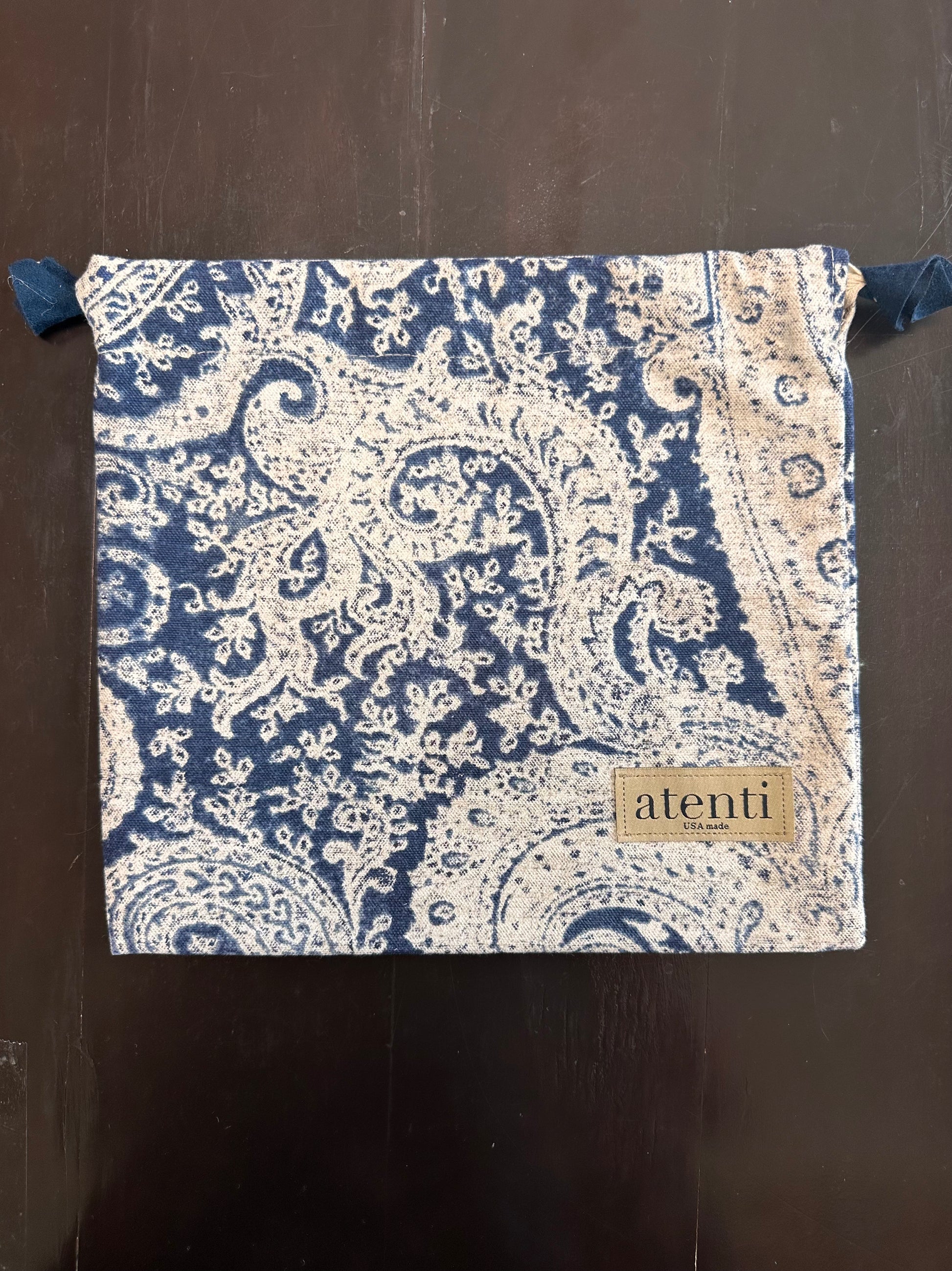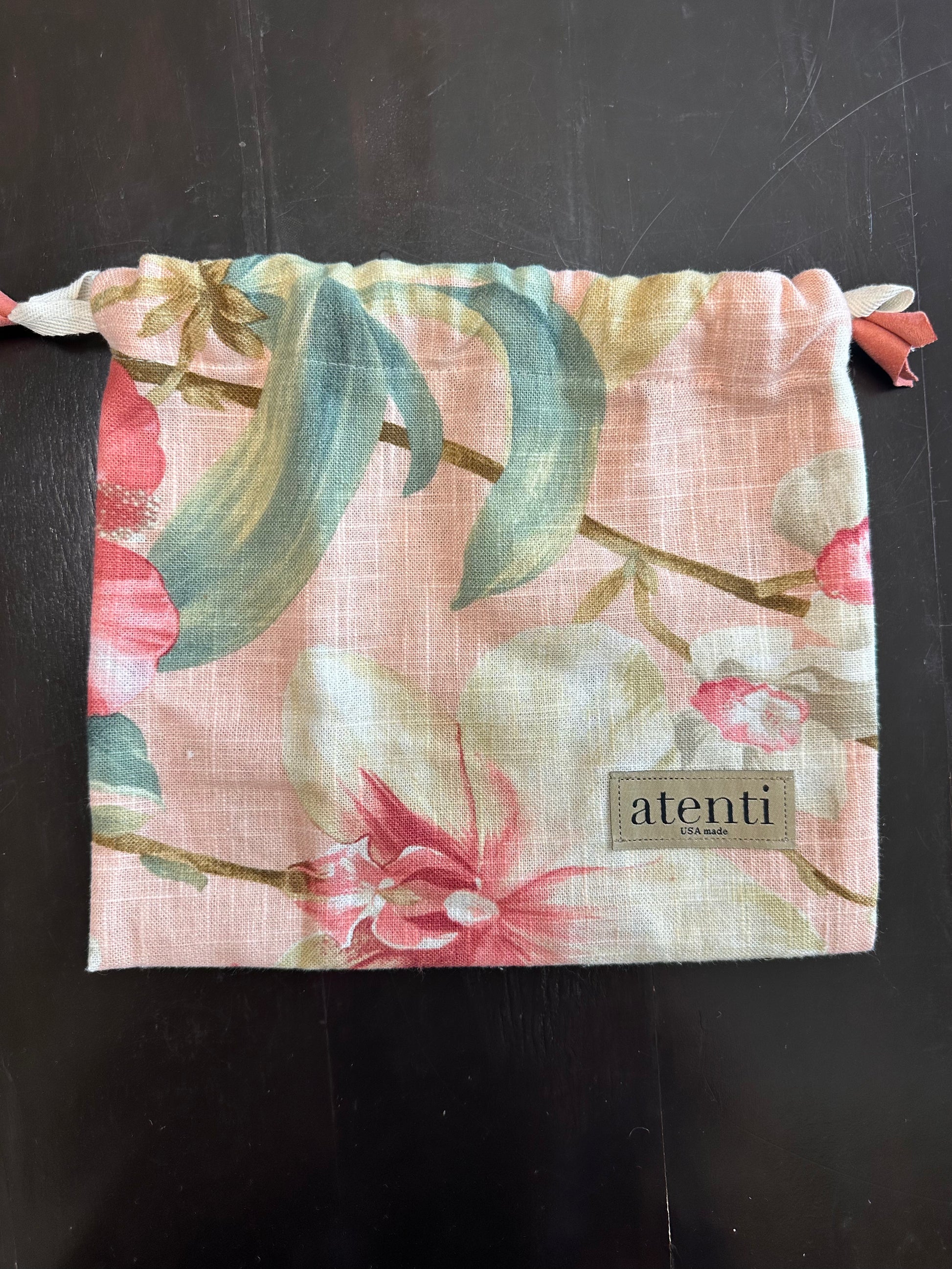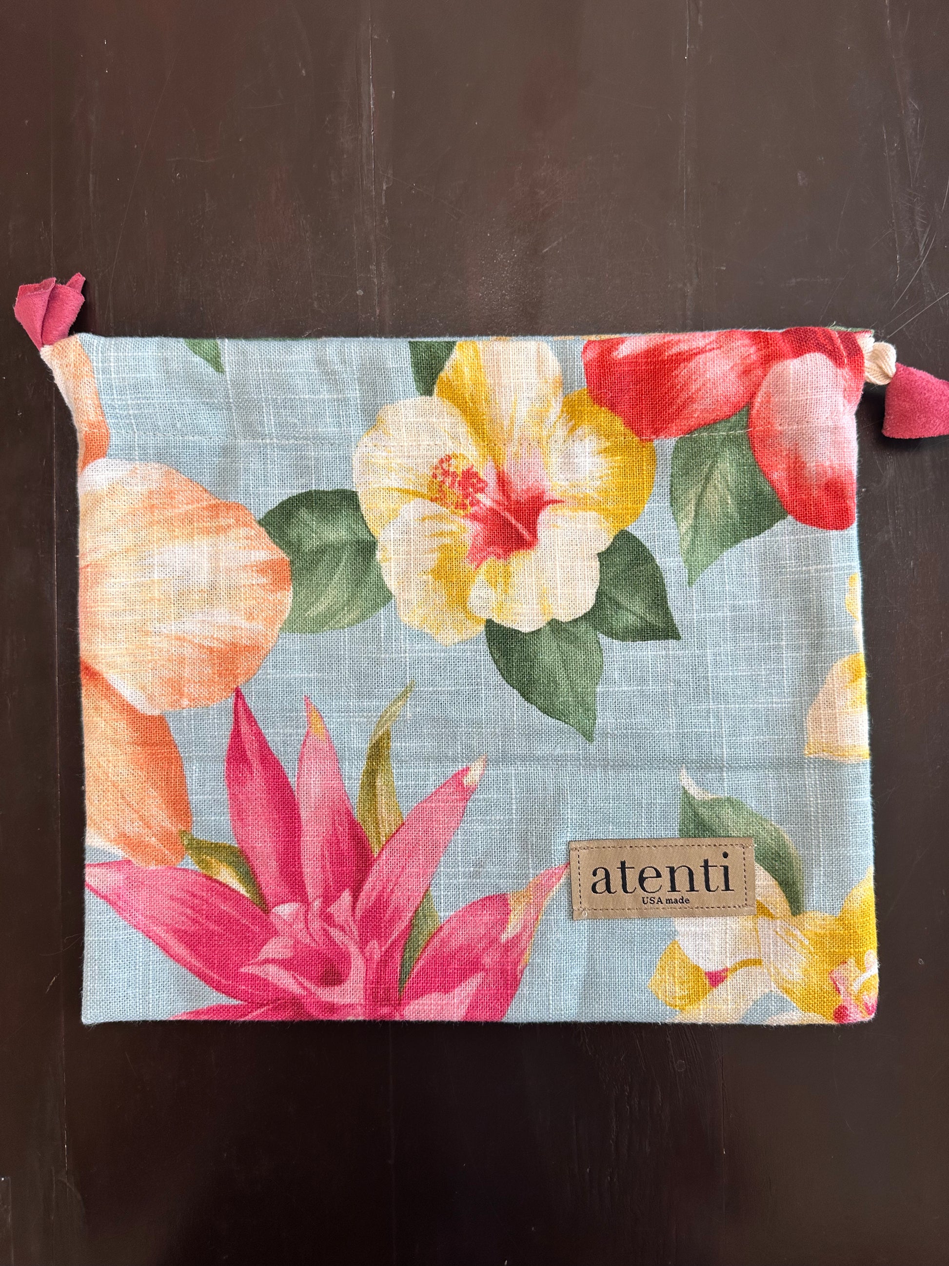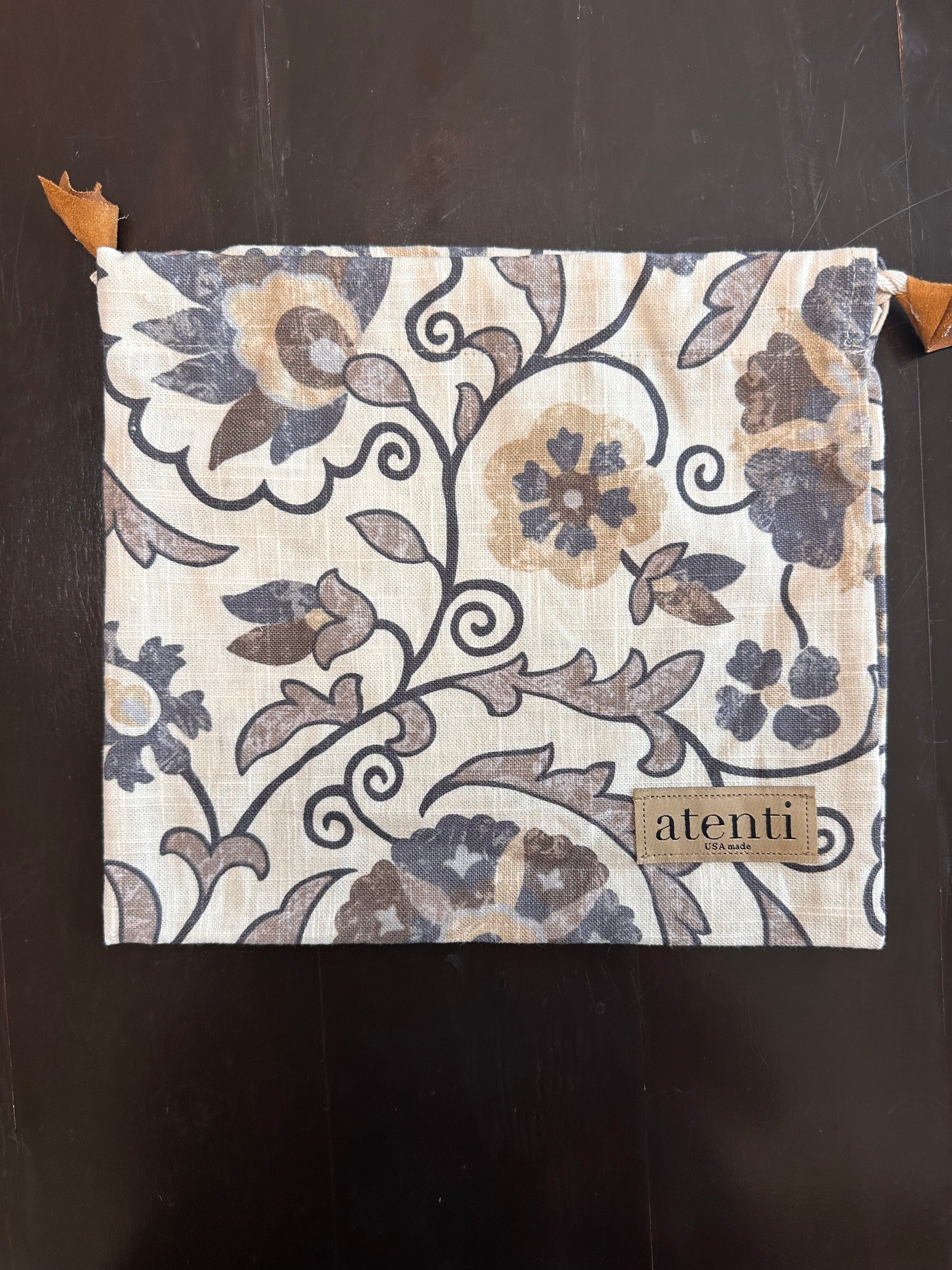 These small drawstring bags are perfect for small projects. Lightweight, with a cute touch on the drawstrings. Perfect as a little purse with wallet inside and a project, fits over your wrist quite nicely. Machine wash and lay flat to dry. I love it. You cannot have too many of these.