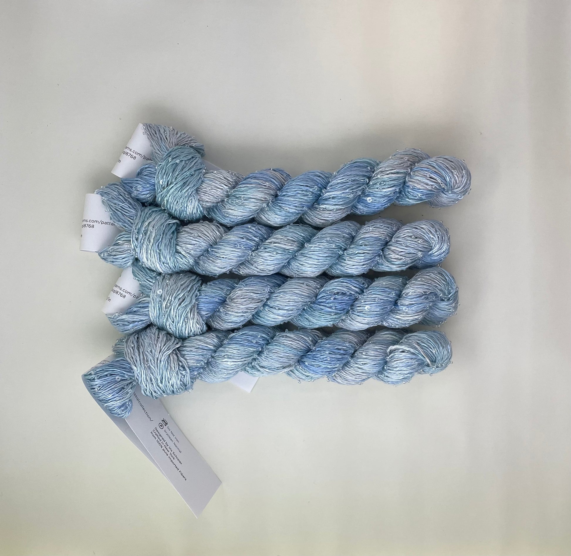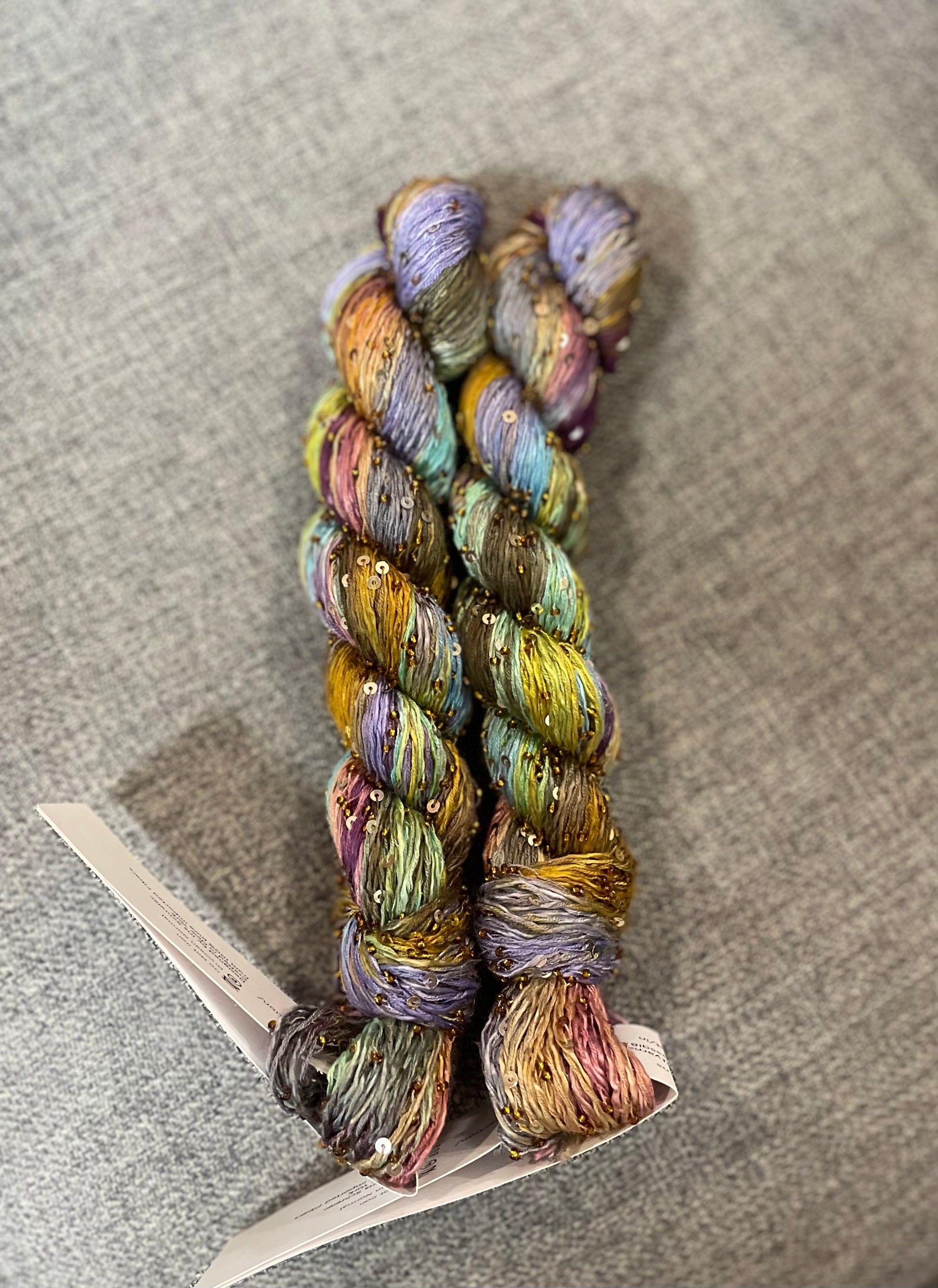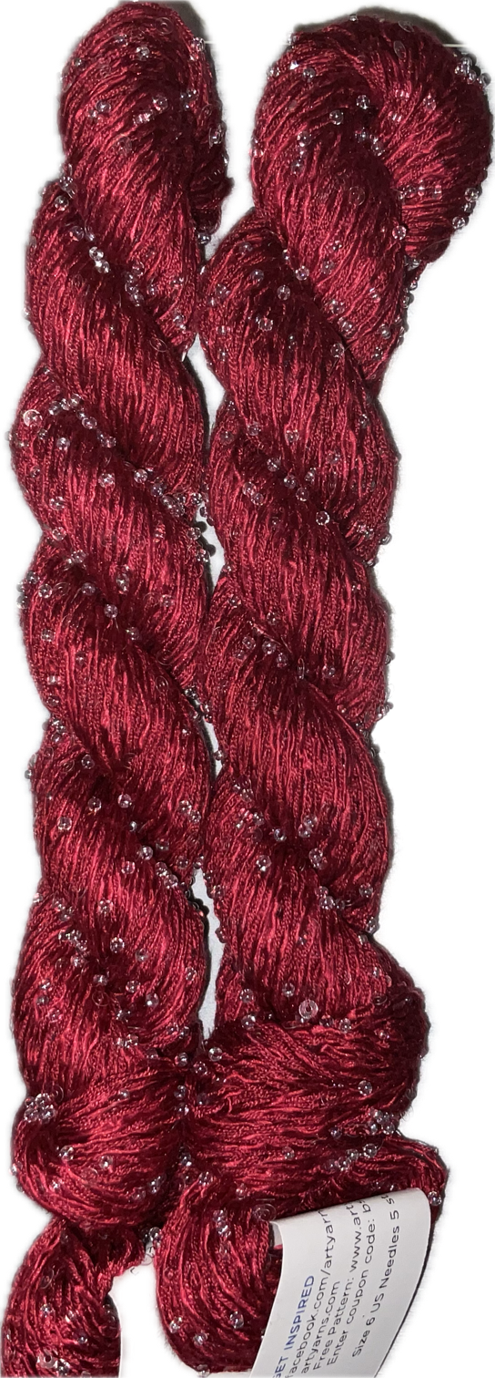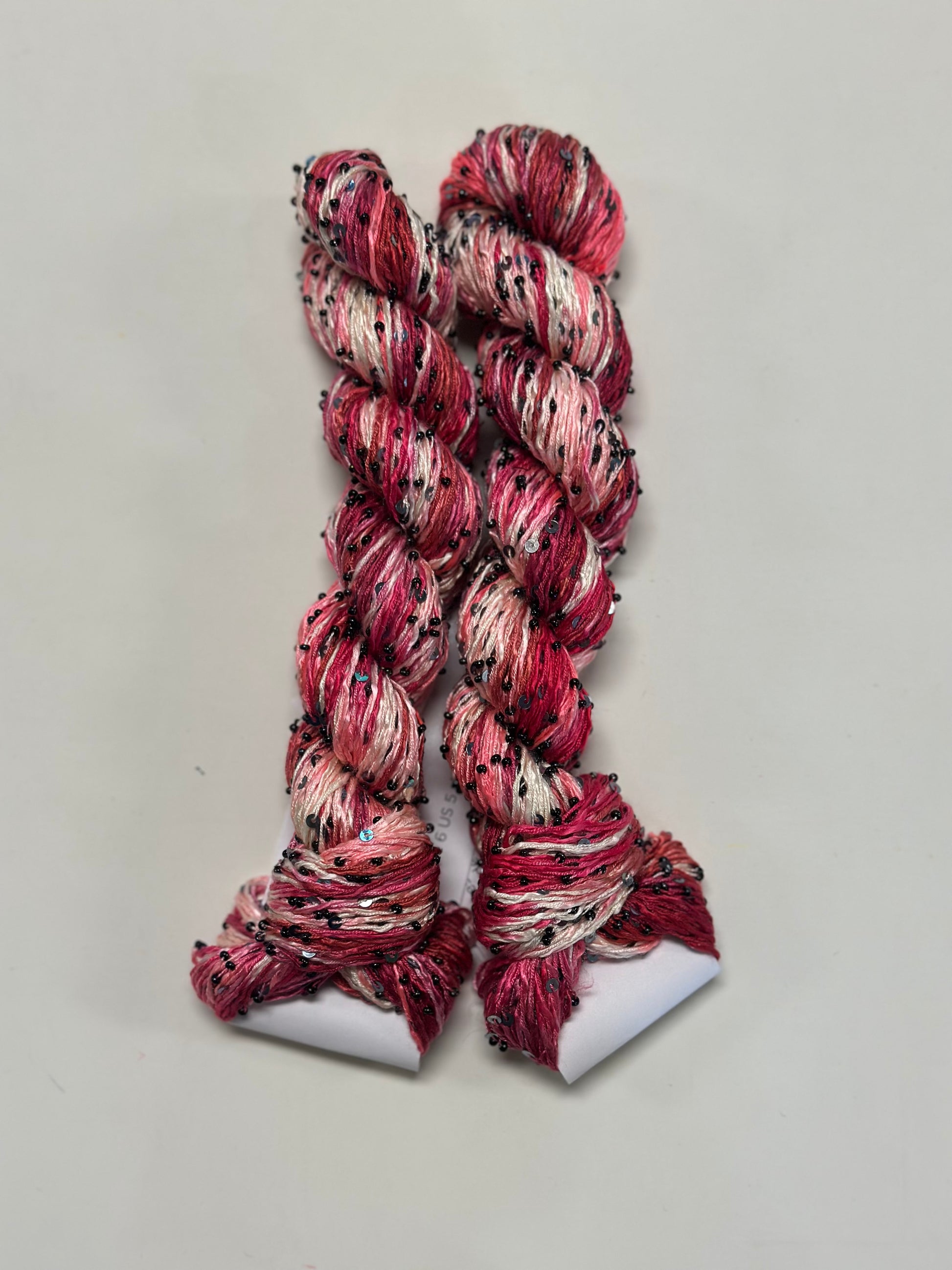 A light weight silk has been embellished with a silk strand with gold, silver, clear or black beads and sequins. DK weight