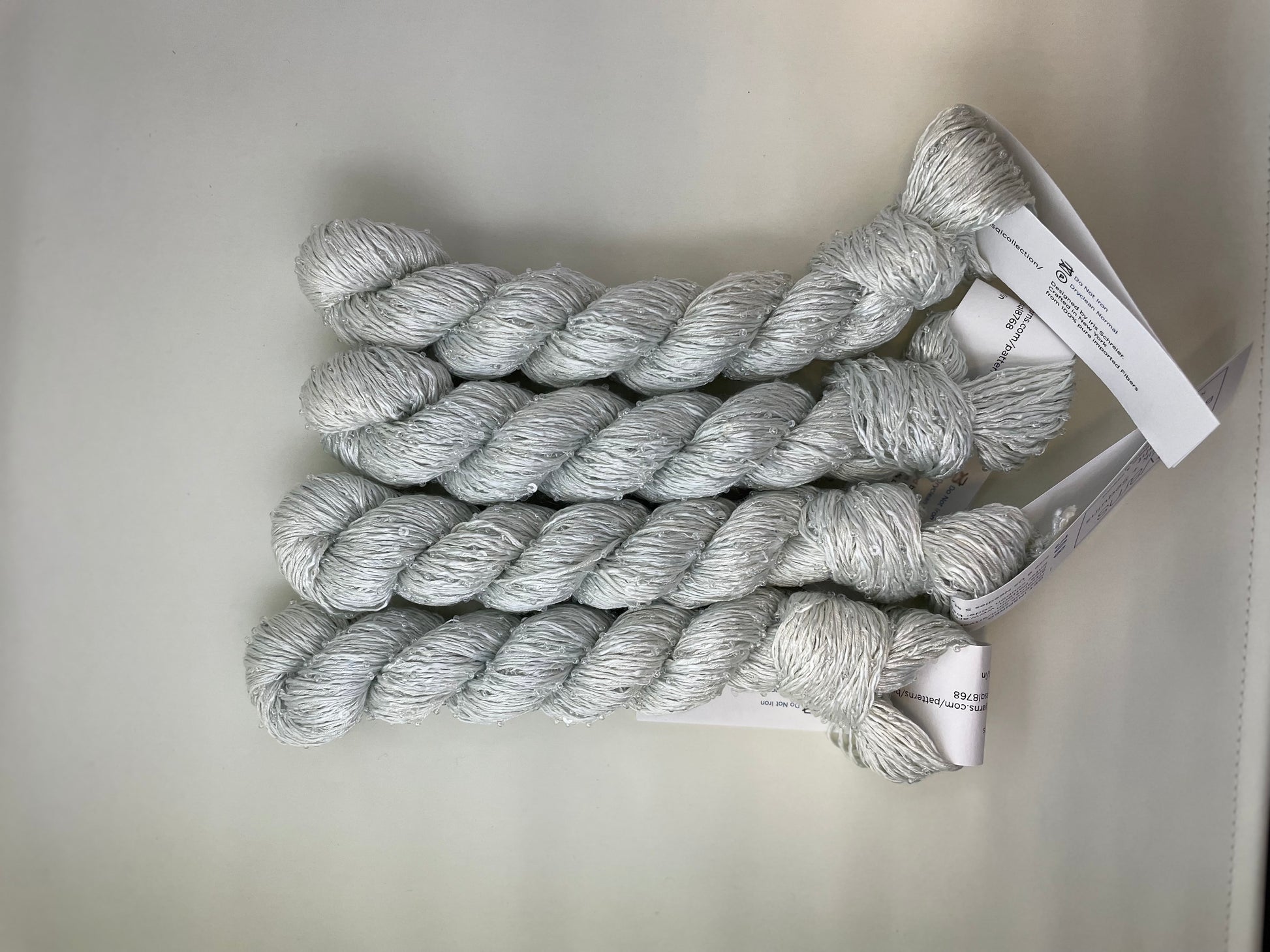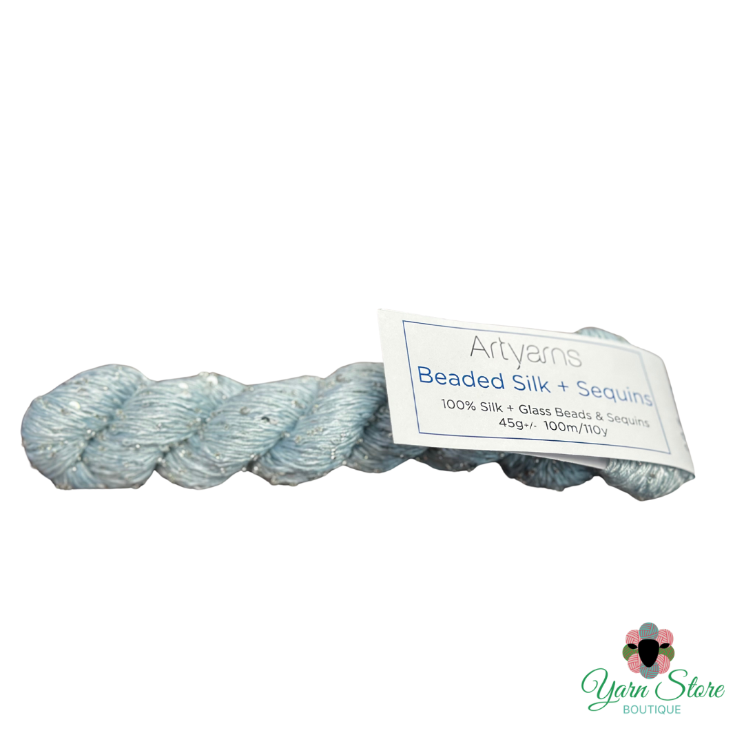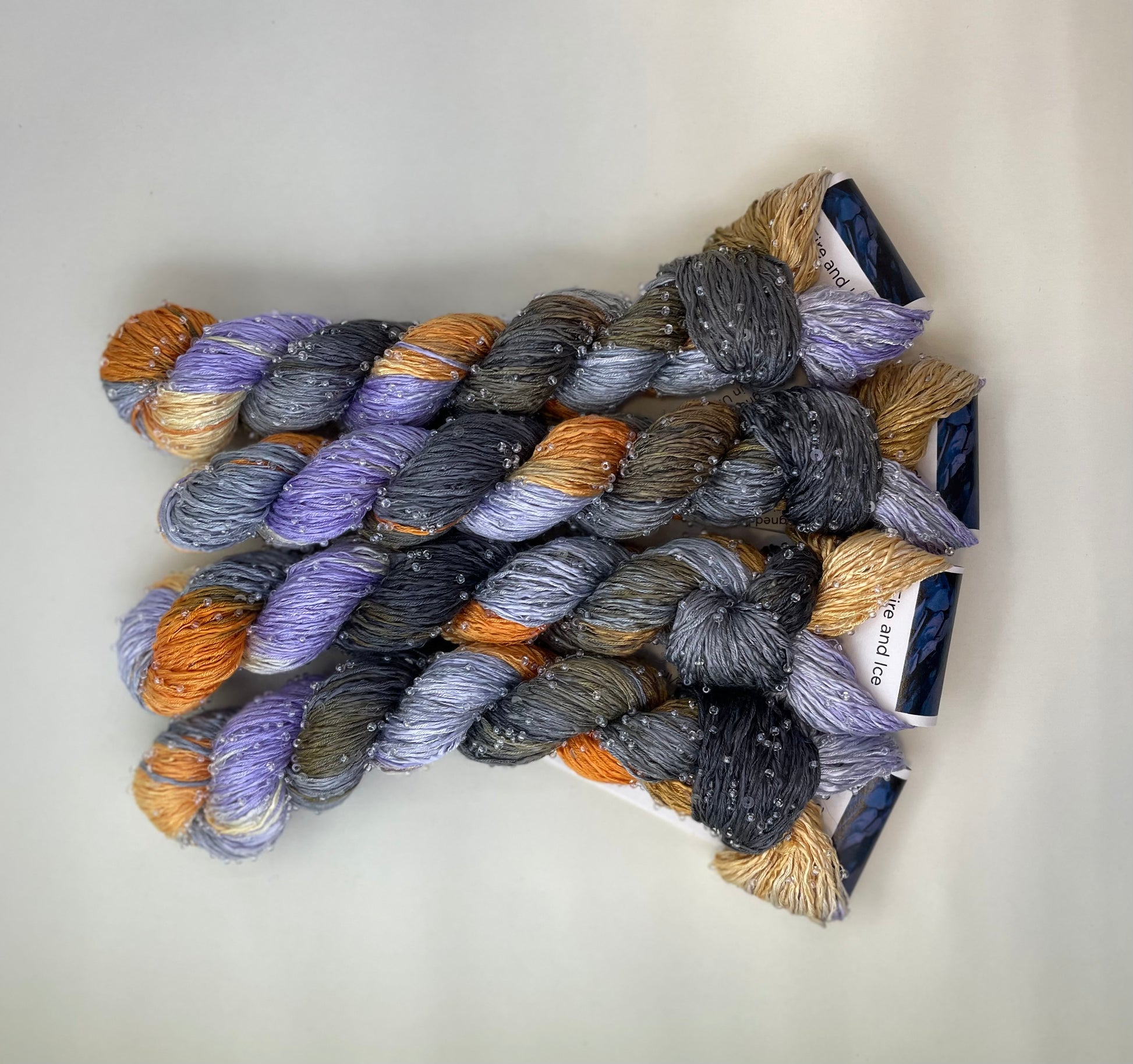 A light weight silk has been embellished with a silk strand with gold, silver, clear or black beads and sequins. DK weight