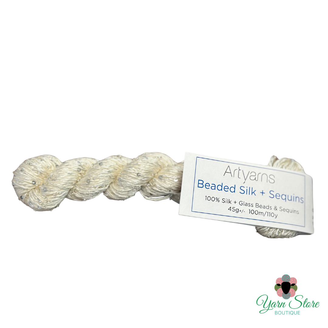 Add some sparkle to your knitted project! ArtYarns has create this lightweight silk yarn embellished with a strand of gold, silver, clear, or black beads and sequins. This DK-weight yarn comes in solid and variegated skeins.