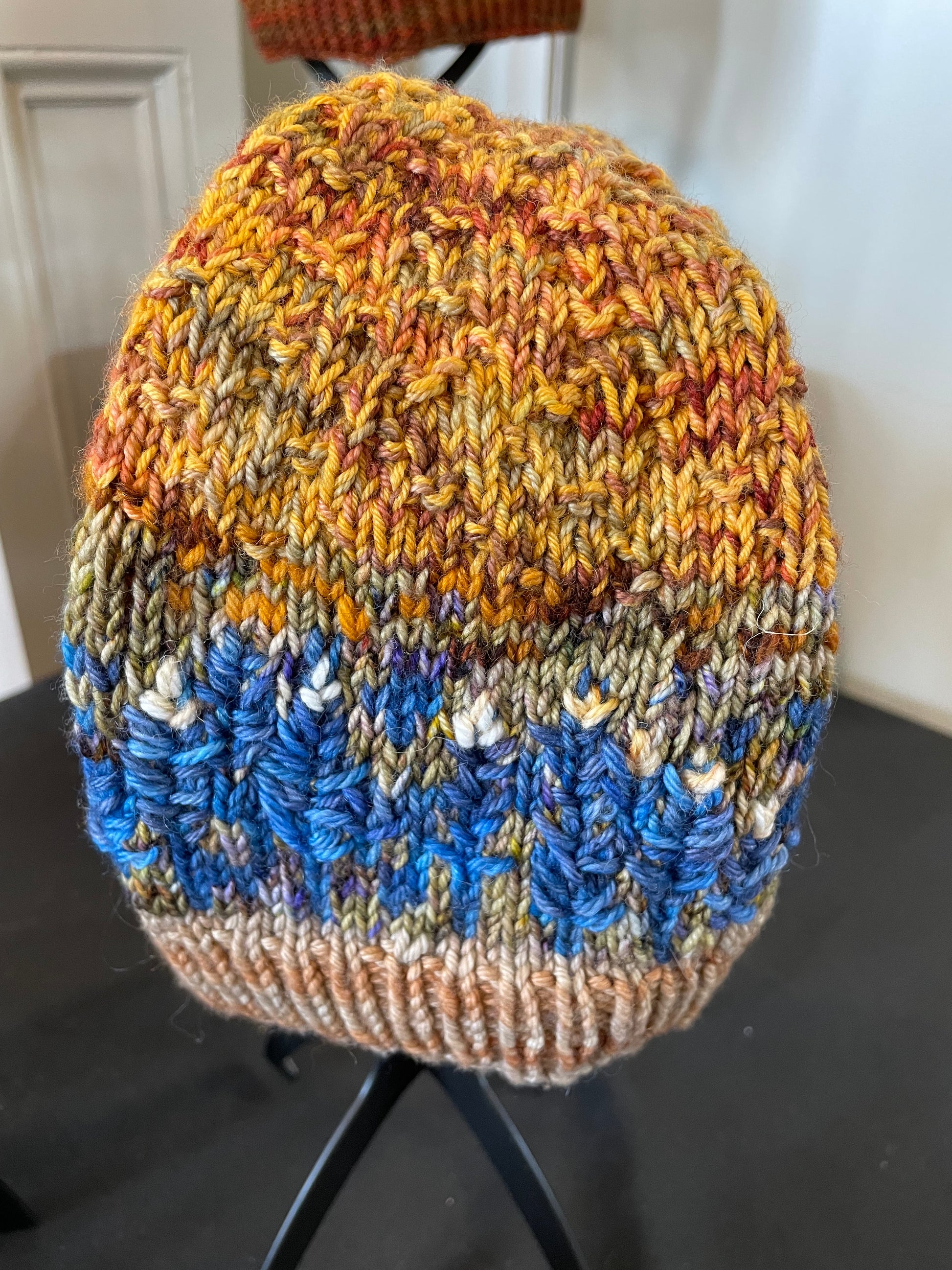 This beautiful hat is knit with a variety of yarns, that create beautiful texture, color combinations, and nice feel to the hand. Hand wash, lay flat to dry.