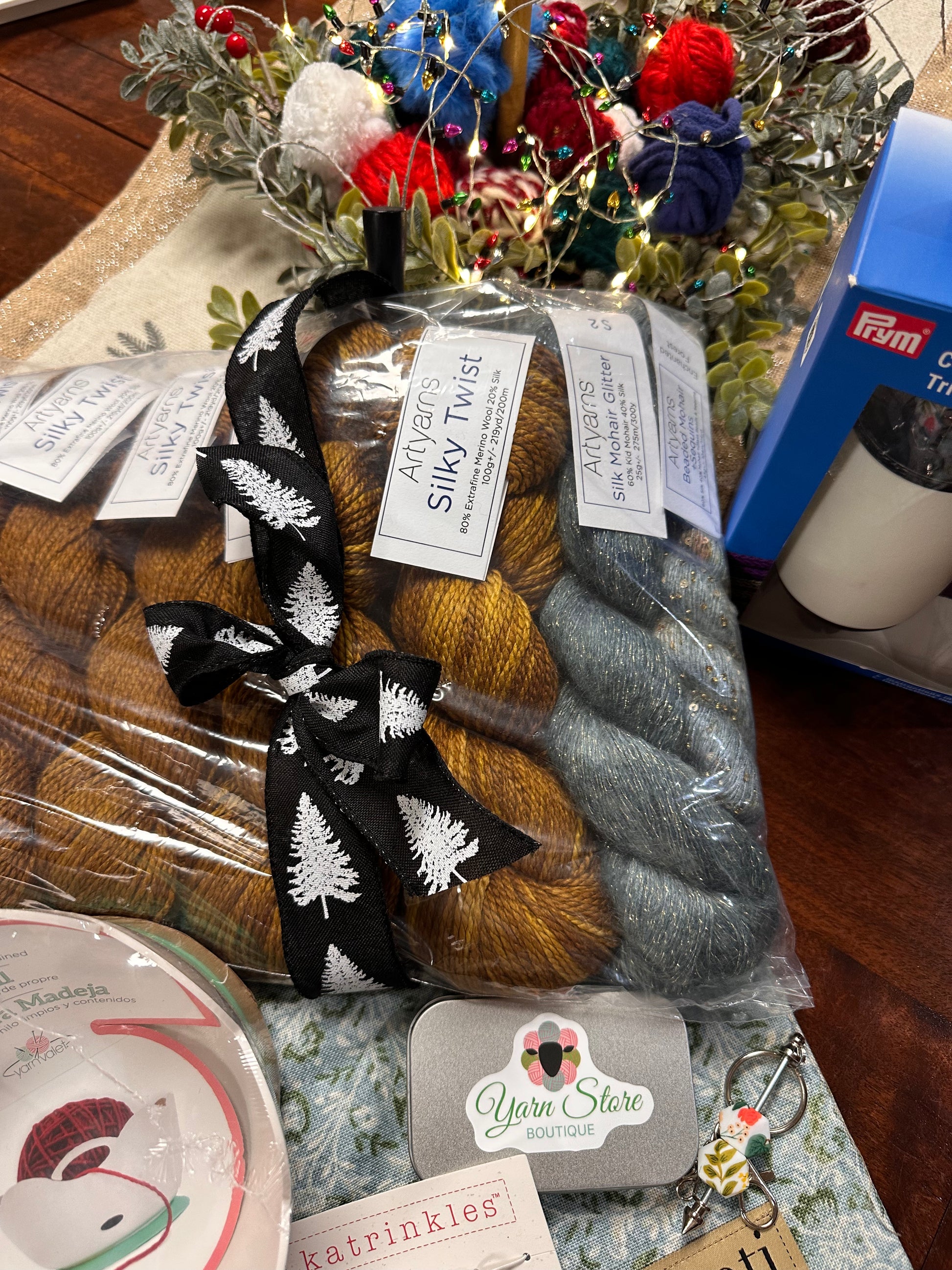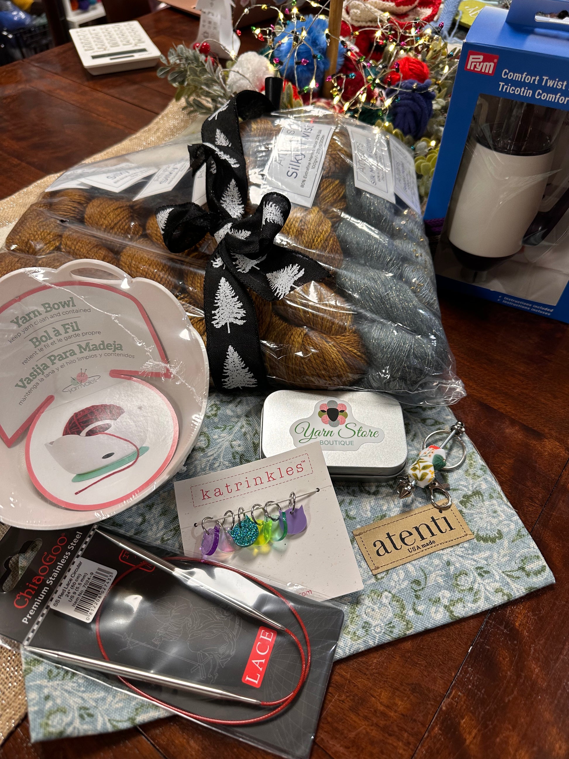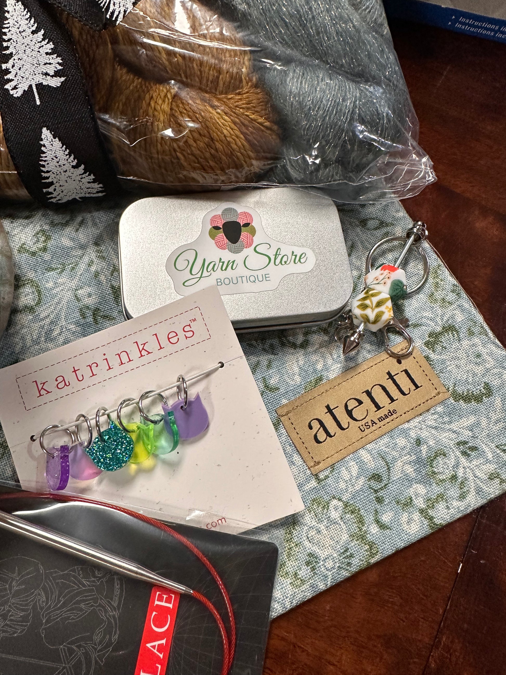 A Prym Comfort Twist (i-cord maker), ChiaoGoo Red Lace Needles, Katrinkles Stitch Markers, Floral Hexagon Tip Protectors and holder, notions tin with YSB Sticker, and Attenti Drawstring bag. The total cost of the kit with these items would retail for $720. We are marking it down lower than when it was just the yarn!
