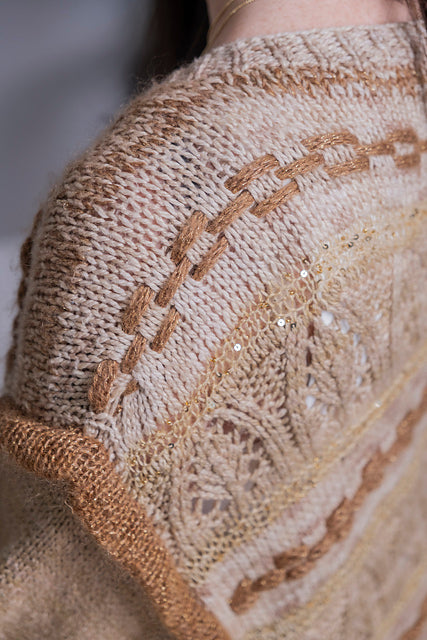 The Silky Twist is heaven, especially when paired with the mohair and the beaded silk and sequins which is the new fall color - enchanted Forest. We love it! The cost of the kit does include the pattern, but because this is a sweater quantity, there is a special bundle price. Using size US 9 & US 7 Needles.