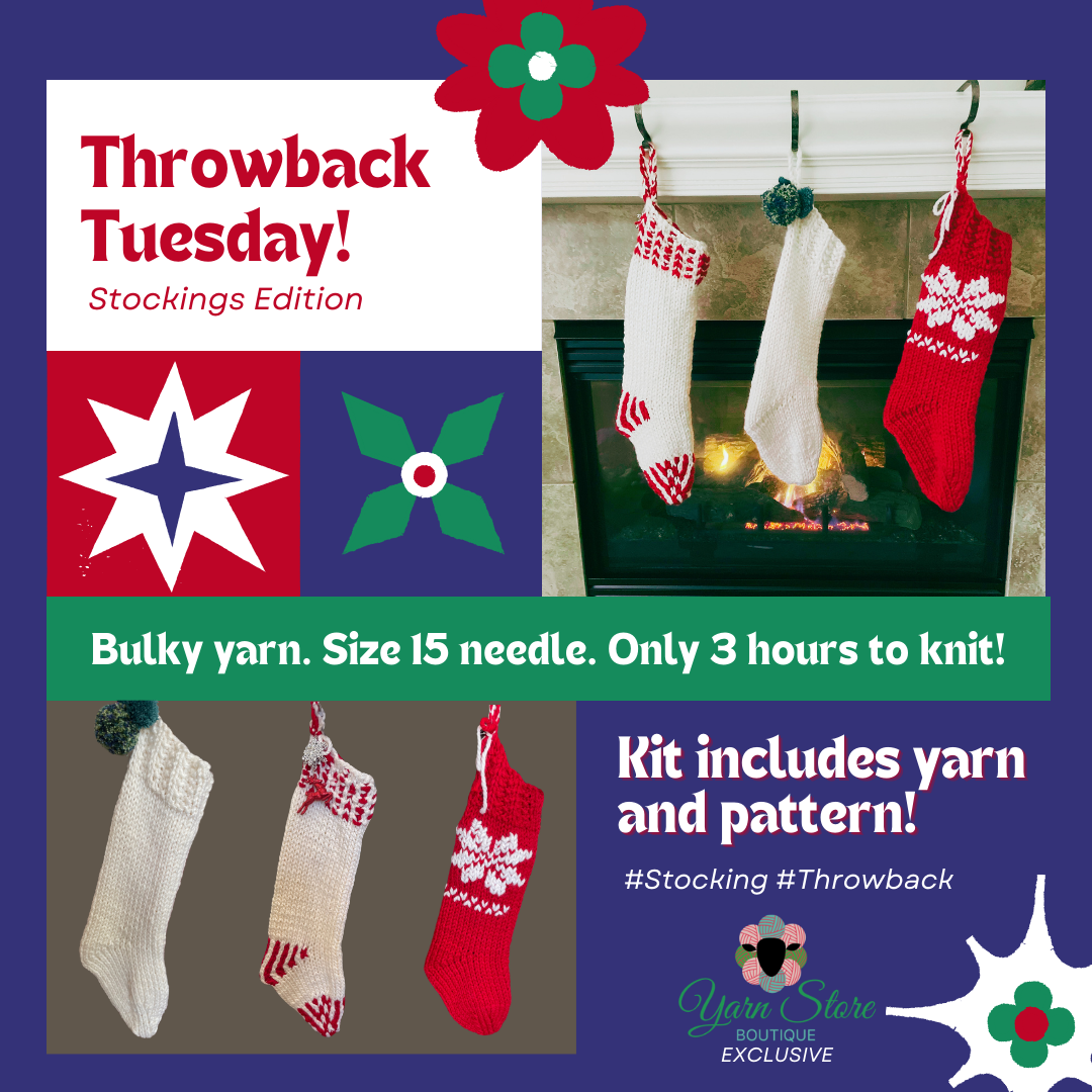 Keep yourself in Christmas Mode with this easiest stocking to knit. Maybe three hours to knit, then seam it up or embellish it. You can choose a single color or two colors, your choice. But we have kitted these up with single colorways, we always have more color options as well in the store. Kit includes: enough yarn to make a single stocking, pattern, and a darning needle to seam it together. You will need a size 13 US needle.