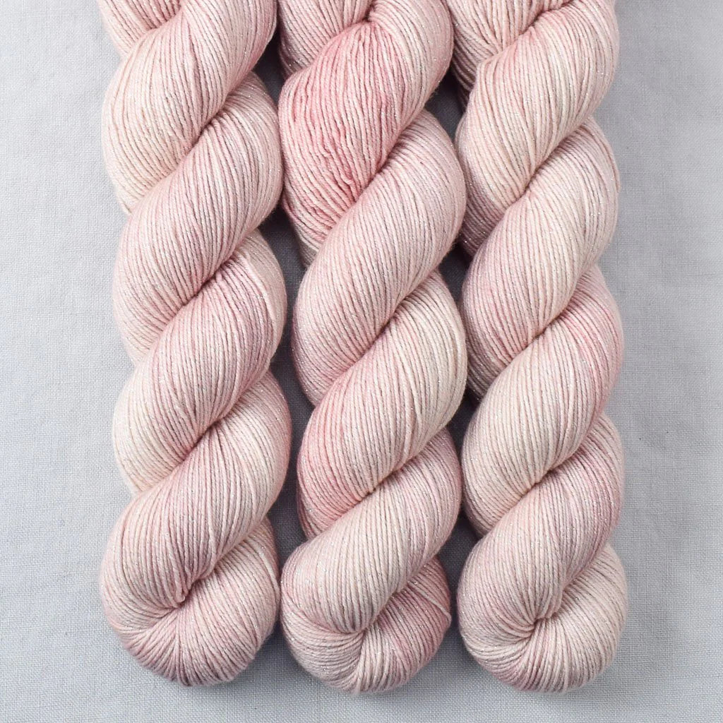 Estrellita is a fun choice for glam socks and shawls, with a flash of sparkle running throughout the skein! The Lurex is a silver-colored ply carried alongside the superwash Merino.