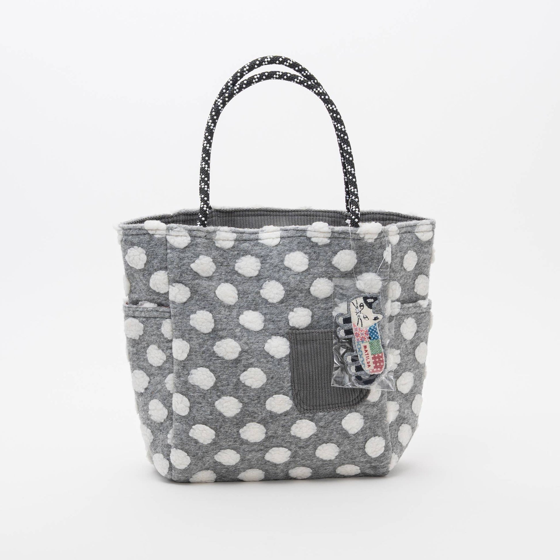 Crafted from a durable polyester-cotton blend, this unique tote features an eye-catching bobble dot (pom-pom) texture that adds a fun, tactile dimension. Designed for functional everyday use, it includes multiple exterior pockets (side slip pockets and a corduroy-textured front pocket) for easy organization. The sturdy, colorful rope handles are comfortable for handheld or shoulder carry, making it ideal for running errands, casual outings, or carrying your lunch and essentials.