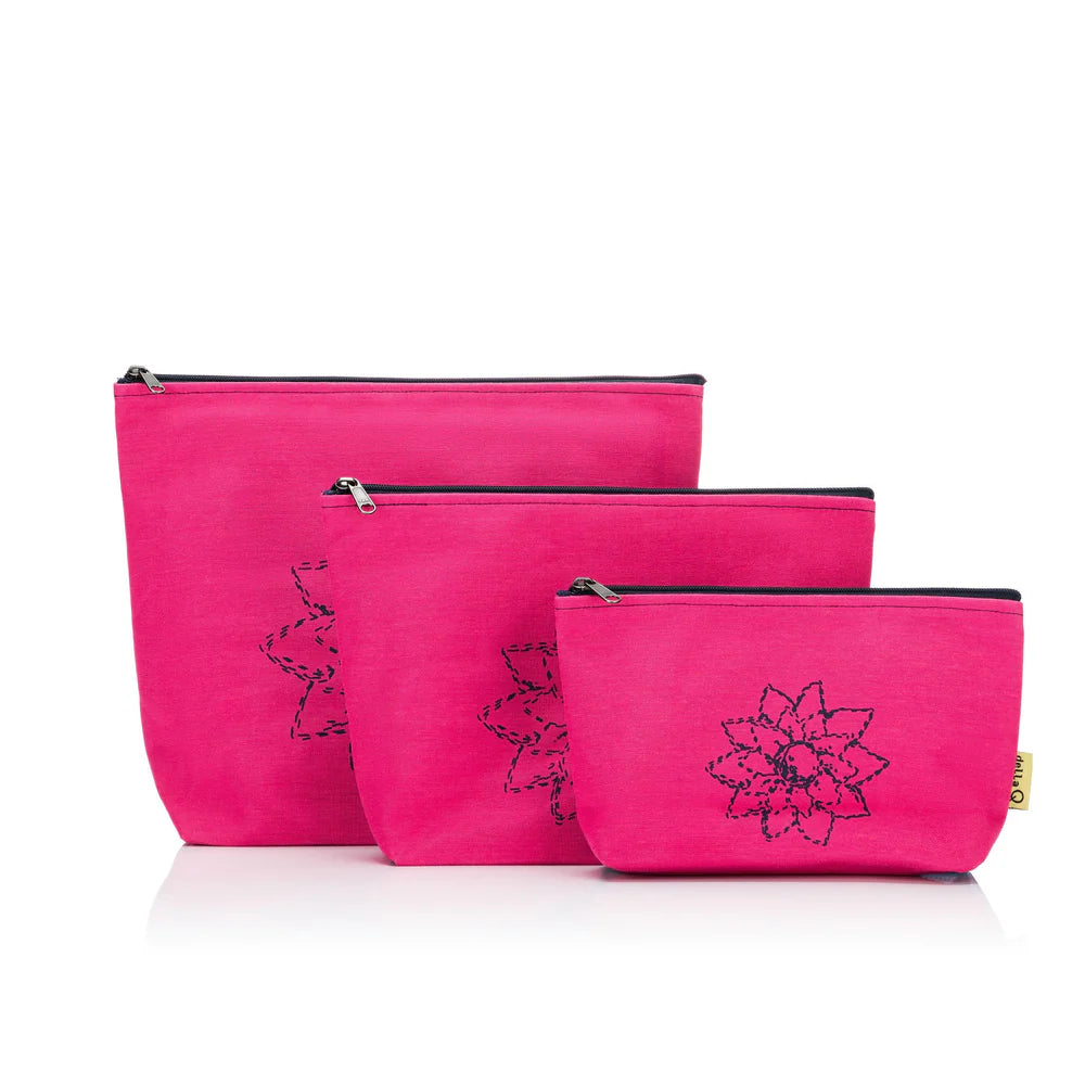The Mesh + Zip collection is a matching set of three nesting zipper pouches. Each bag has fabric on one side and mesh on the other. The sets include three pouches that nest perfectly inside one another to save space. The small size is great for notion storage while the large pouch is big enough for a small 1-3 skein project.