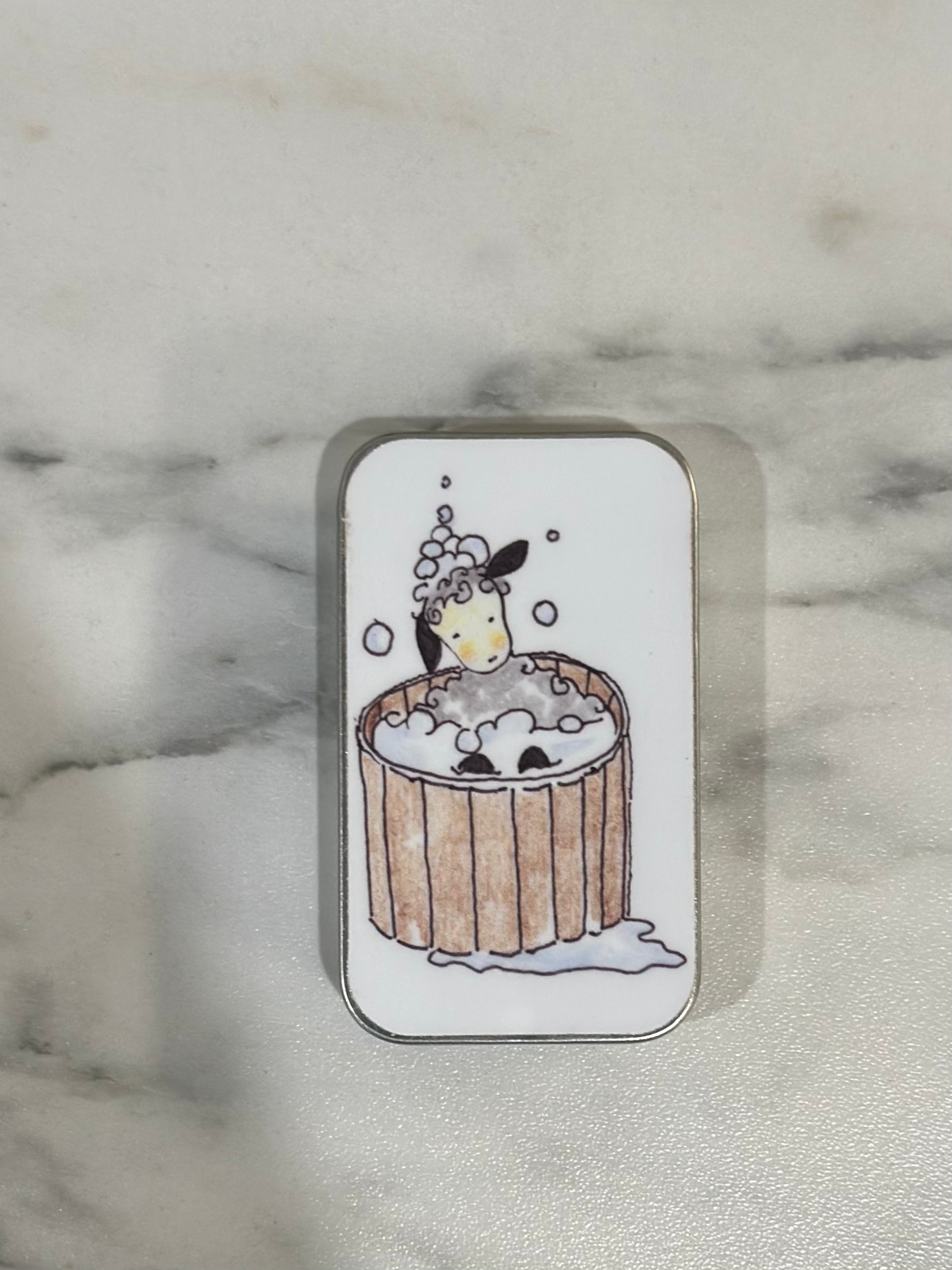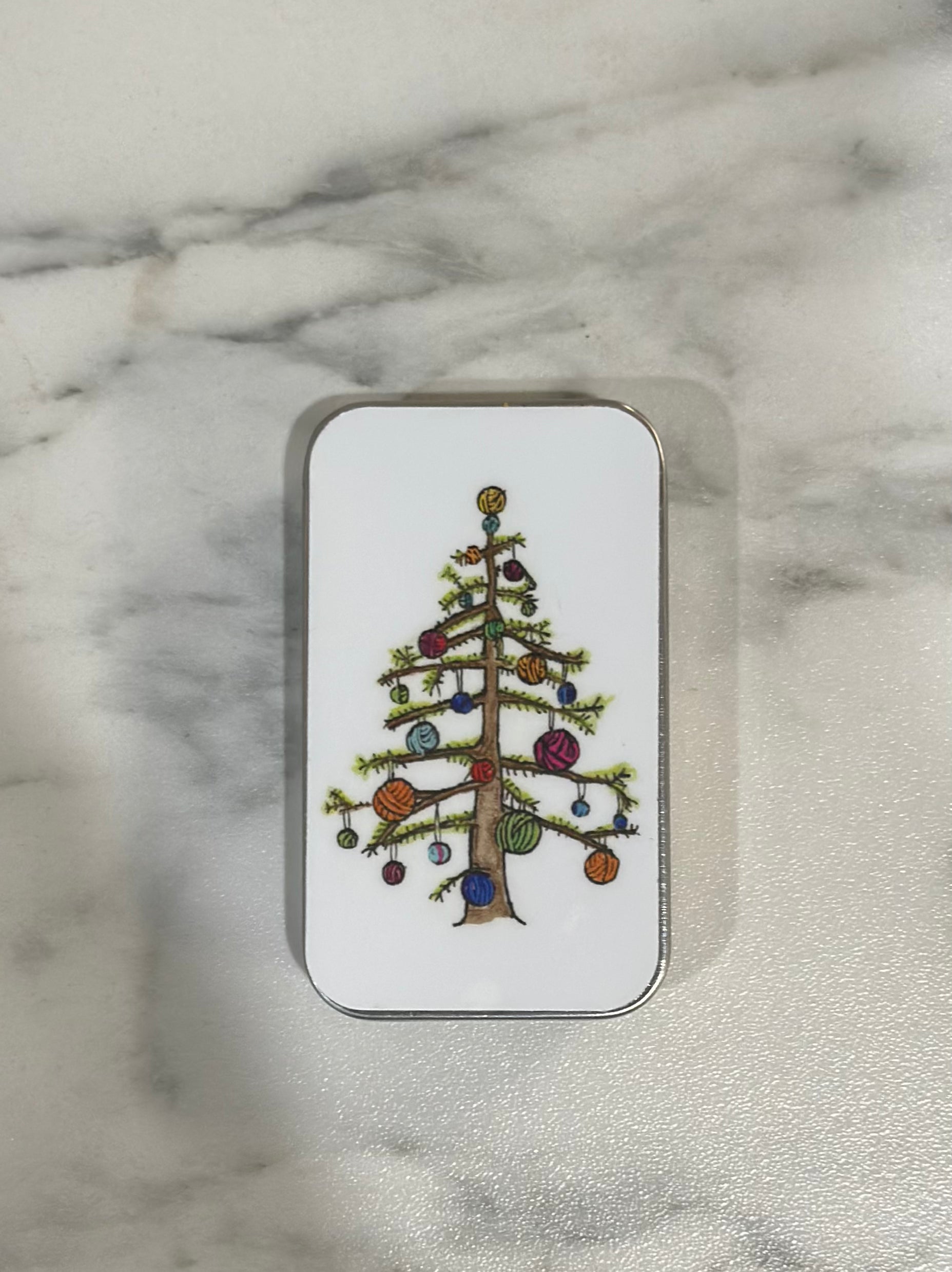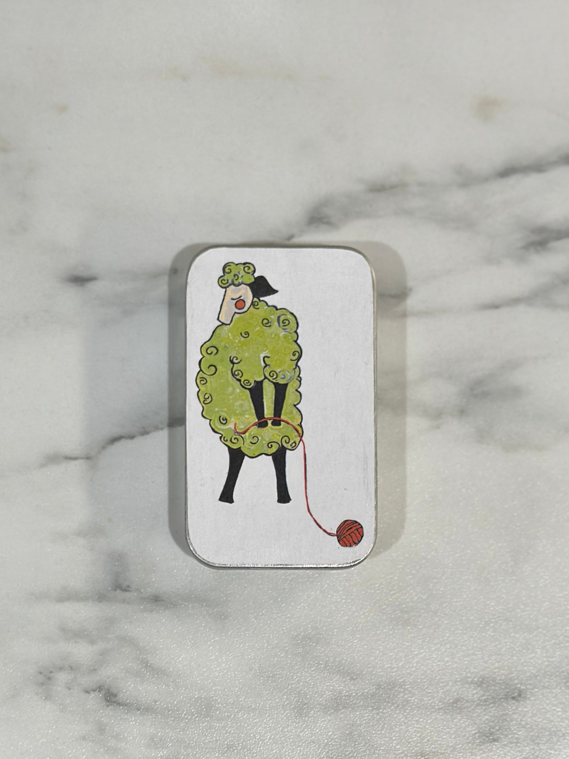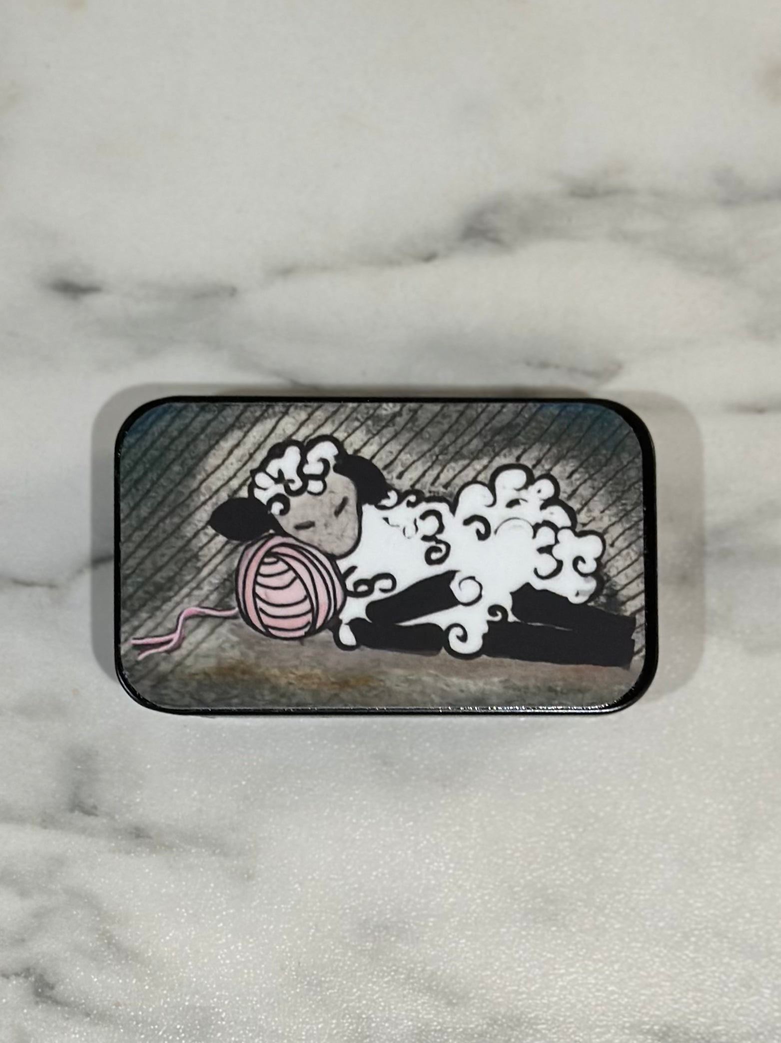 Our handy Stitch Marker Tins (or Notions Tins) are perfect to store our Washing Instructions Stitch Markers (and all the rest of your stitch marker collection!) Featuring Scholarsheep and Dozing Pink Sheep on black tins and our Tennenbaah Tree, Flirty Sheep, Lay Flat To Dry, and Handwash Lamb on silver tins, these boxes have a fitted slide lid for easy access to your stitch markers. Decoupage with a latex finish. 2 3/4" X 1 5/8" X 1/2".