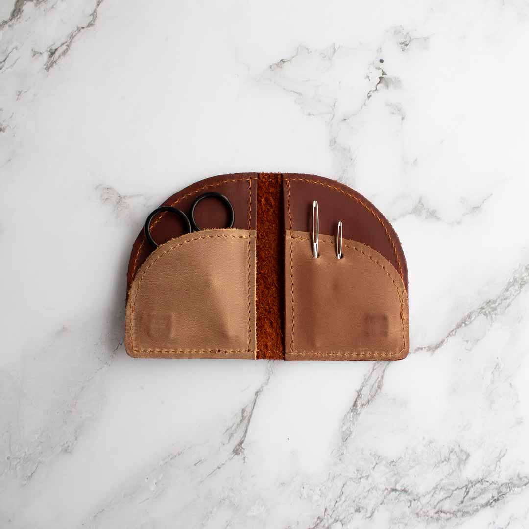 Always be prepared for an impromptu knitting or crochet session with our On the Go notions fold. Cute, tiny and super practical, this little wallet is lovingly handmade from the same genuine leather as our Notions Clutch. It comes fully stocked with 3 essential notions: a pair of tapestry needles, mini scissors and steel ring stitch markers. About the size of a credit card, it snaps shut with discreet magnets, keeping your tiny essentials secure. It contains one zip and two inner pockets for any other small items that you frequently use on the go (like small stitch holders or mini tailor's tape for example). We love this leather for its beautiful appearance and softness to the touch. Knitting is a tactile art, and we seek to compliment the experience with quality accessories, however tiny they may be :)
