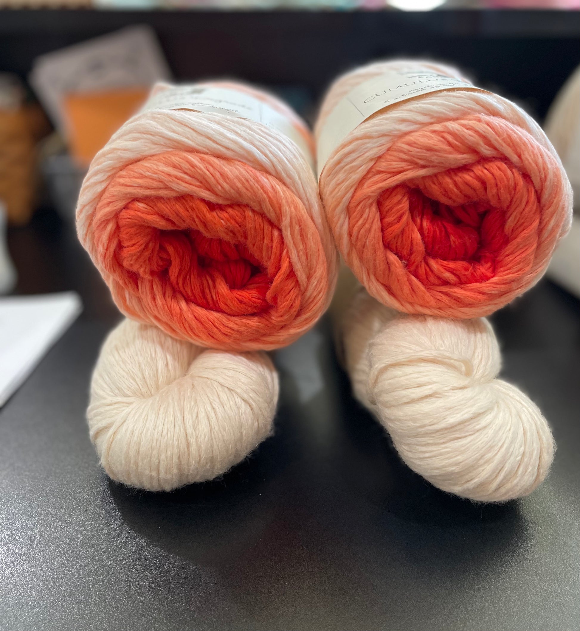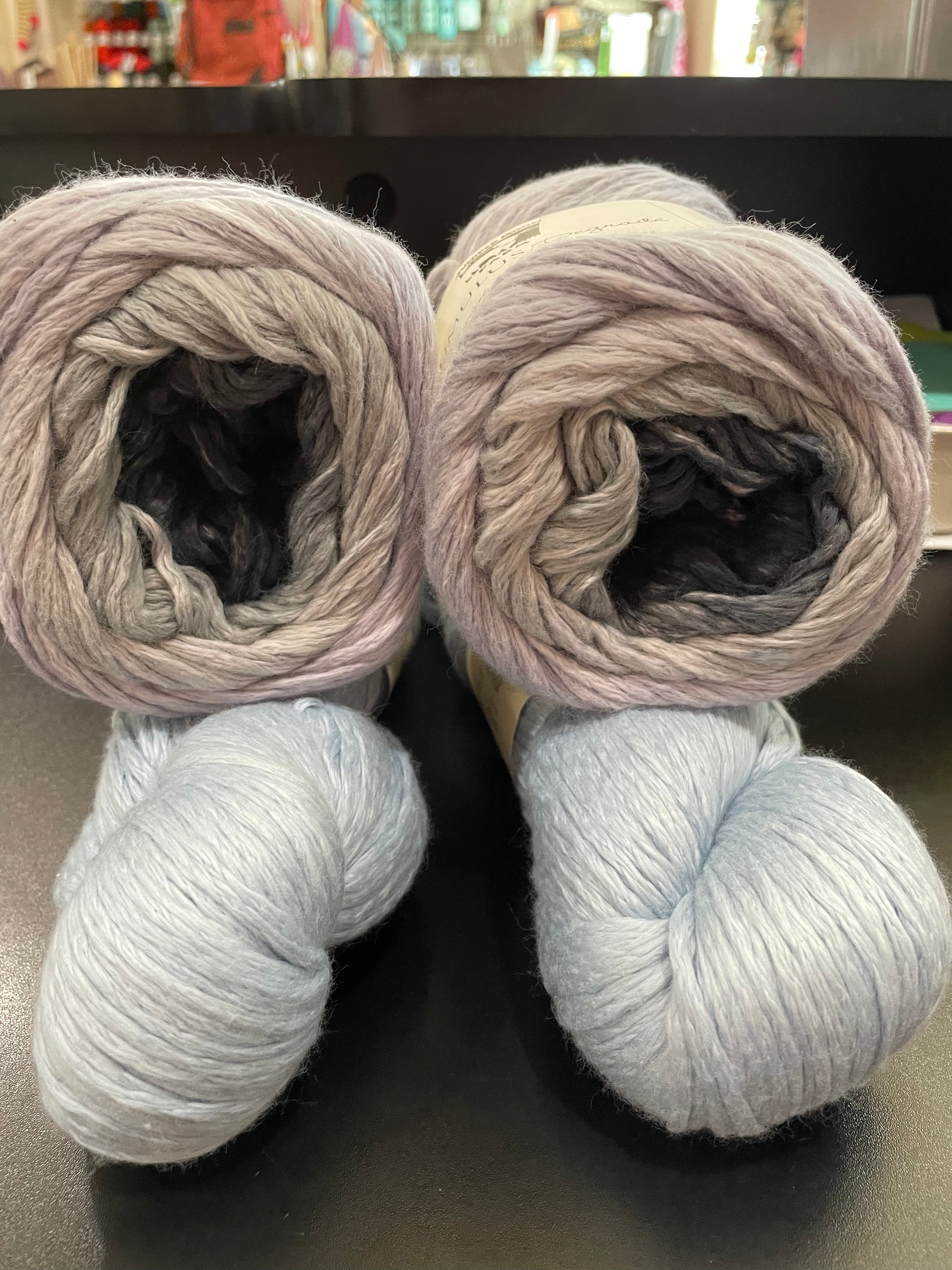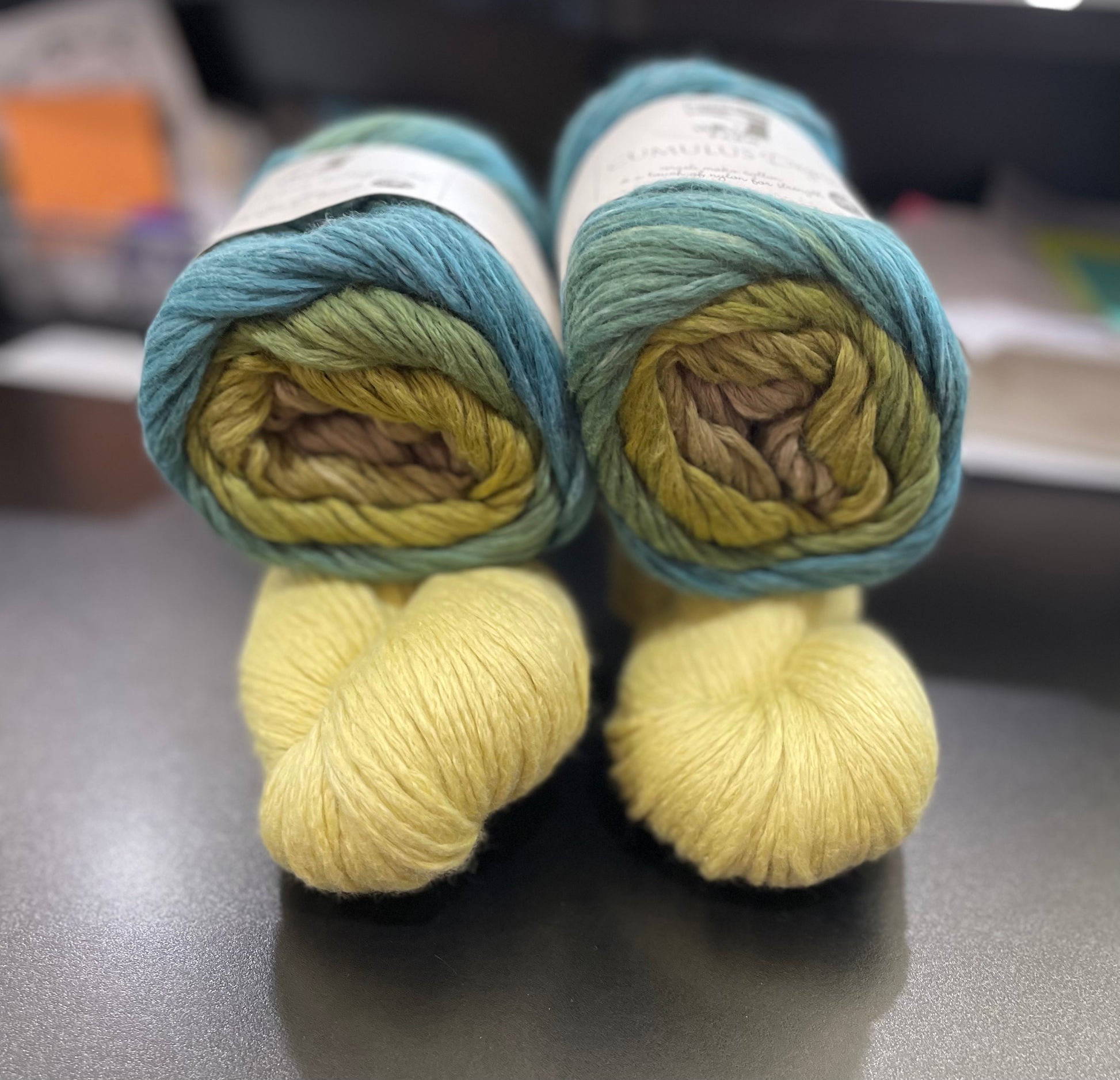 The kit includes two hanks of Cumulus our 2024 favorite yarn and two skeins of Cumulus Rainbow or Cumulus Degrade. The pattern is also included.