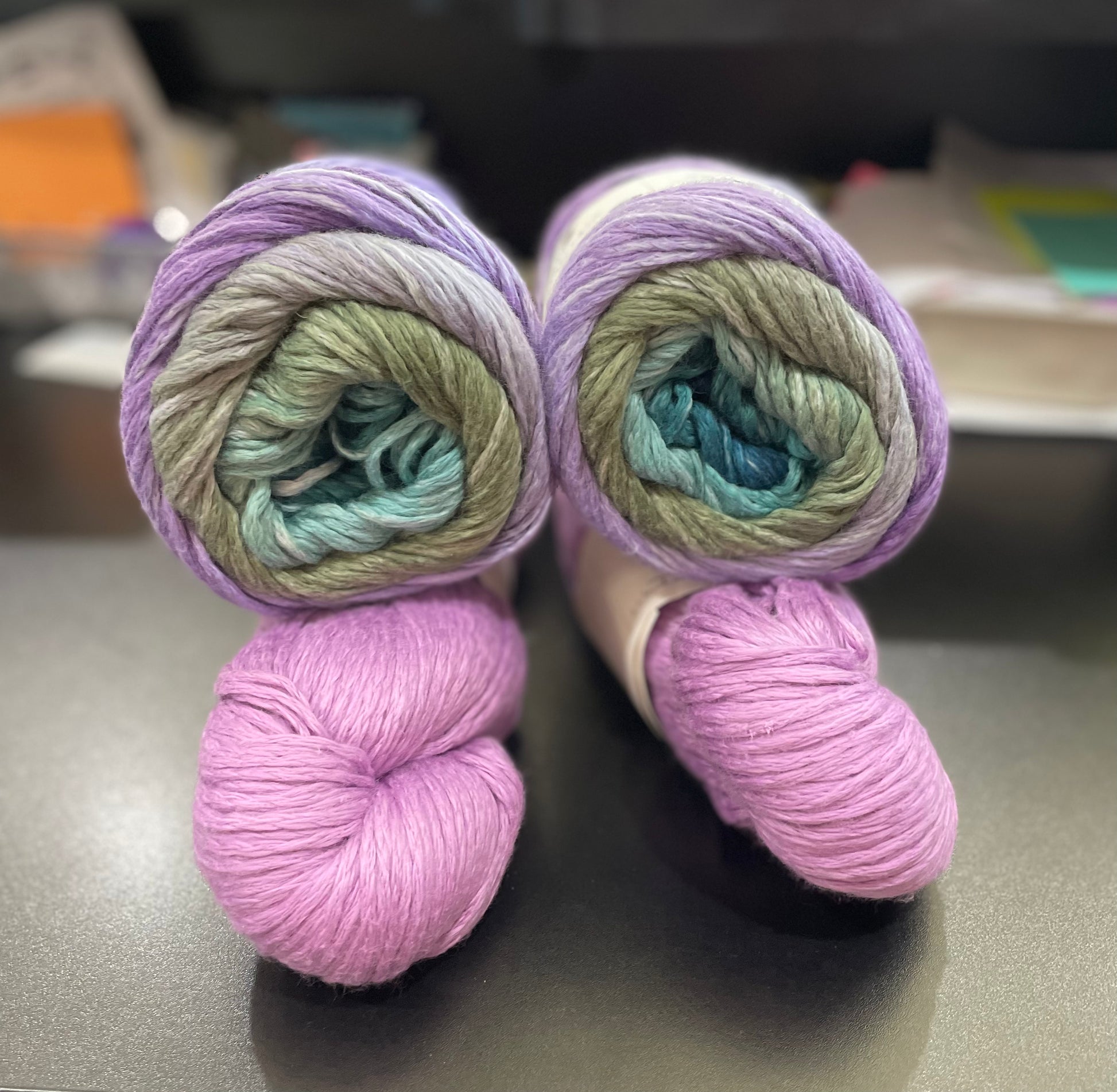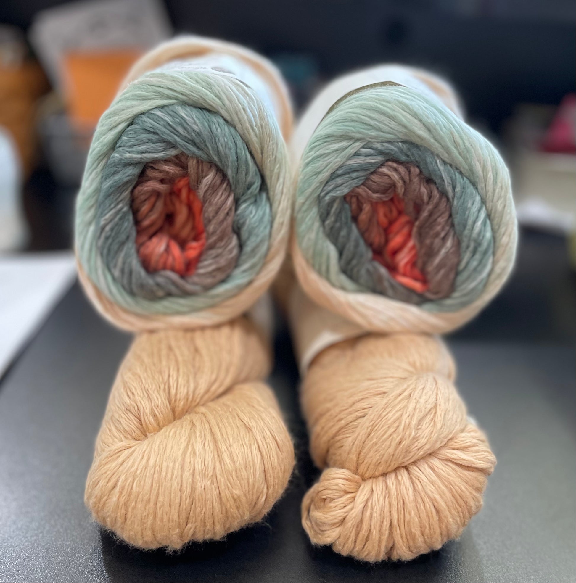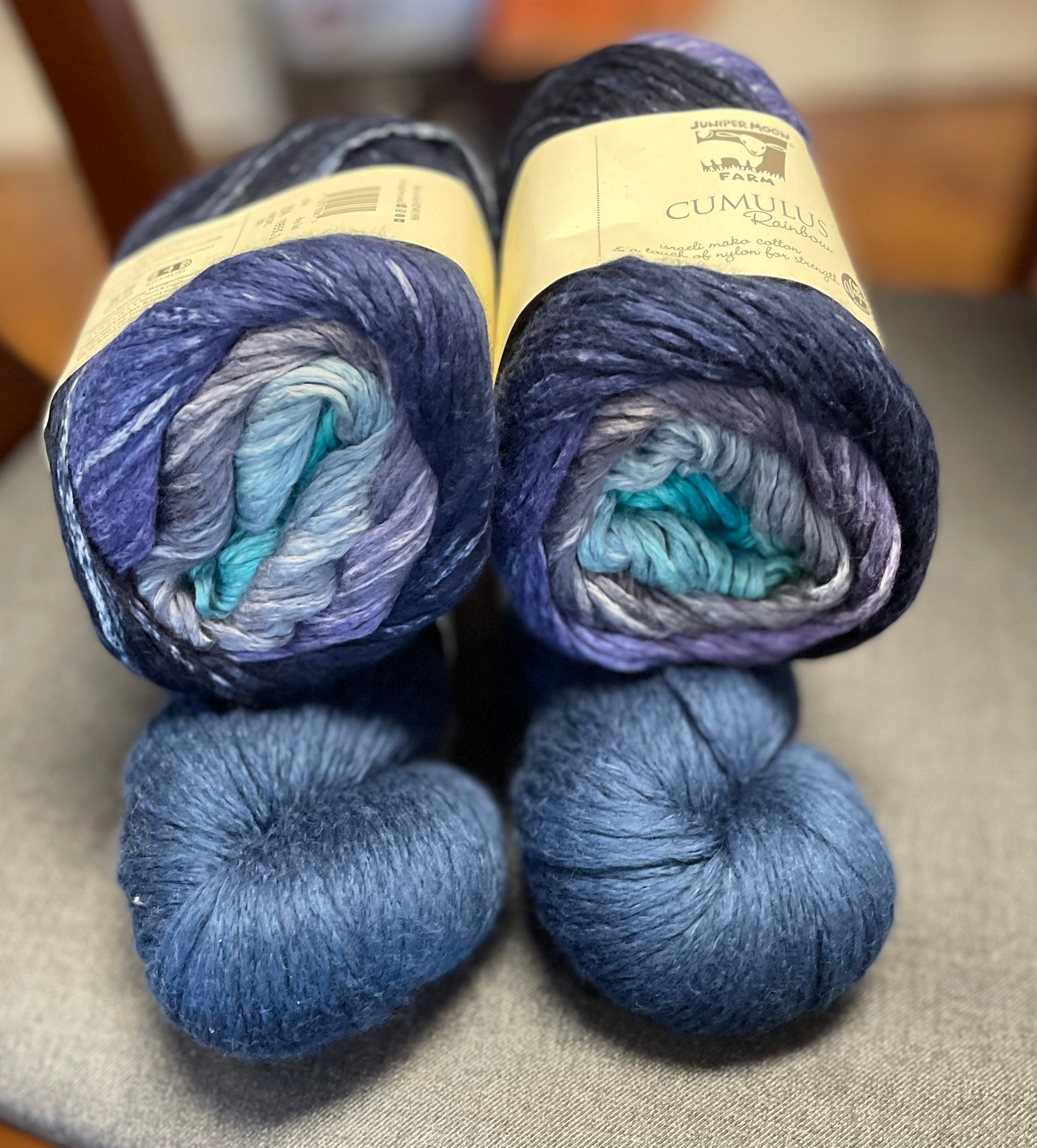 The kit includes two hanks of Cumulus our 2024 favorite yarn and two skeins of Cumulus Rainbow or Cumulus Degrade. The pattern is also included.